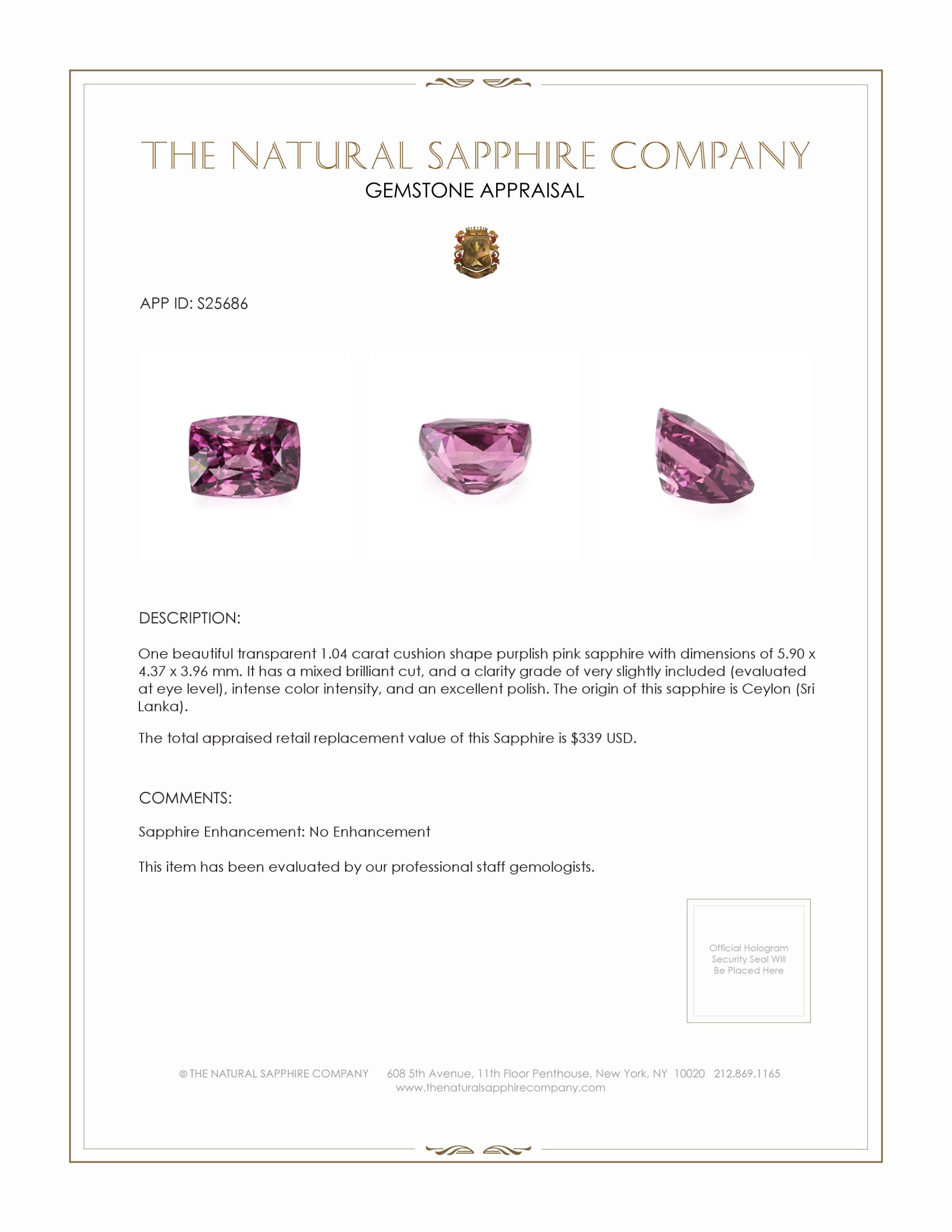 Choosing this purplish-pink sapphire is not just about acquiring a beautiful gemstone. It is about embracing a narrative—a story of timeless elegance, rarity, and meticulous craft. Allow yourself to be enchanted by the undeniable allure of this masterpiece, secure in the knowledge that this piece is not merely a part of a collection, but a celebration of an exclusive tradition upheld by The Natural Sapphire Company.