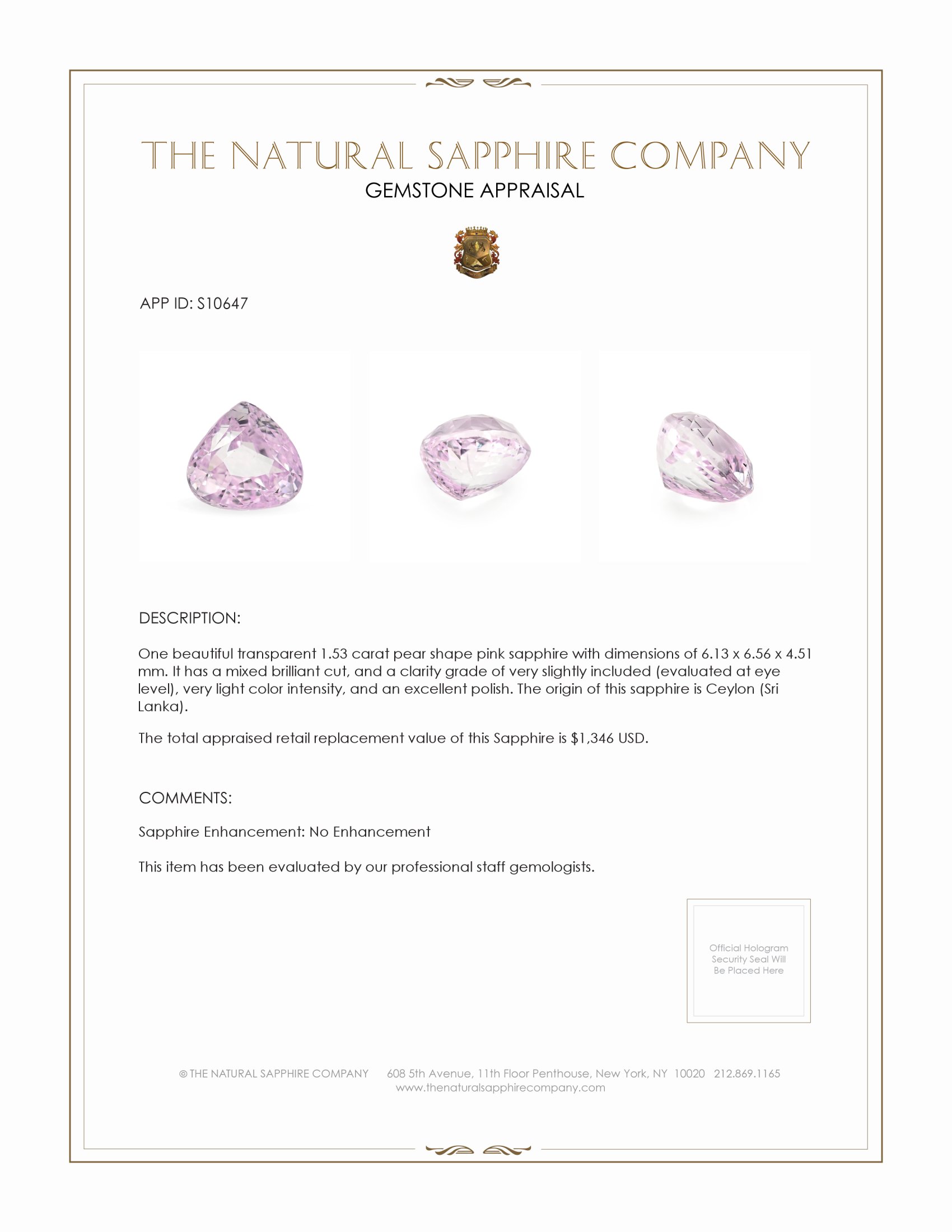 Introducing a gemstone that goes beyond ordinary luxury, capturing the rare and timeless beauty of nature in its purest form. At The Natural Sapphire Company, we present to you a 1.53-carat pear-shaped pink sapphire, a treasure born from the rich lands of Ceylon, that calls to the heart like the whisper of a long-forgotten love song. This sapphire is not just a stone; it is a luminous testament to the wonders of the earth, a piece worth cherishing for generations to come.