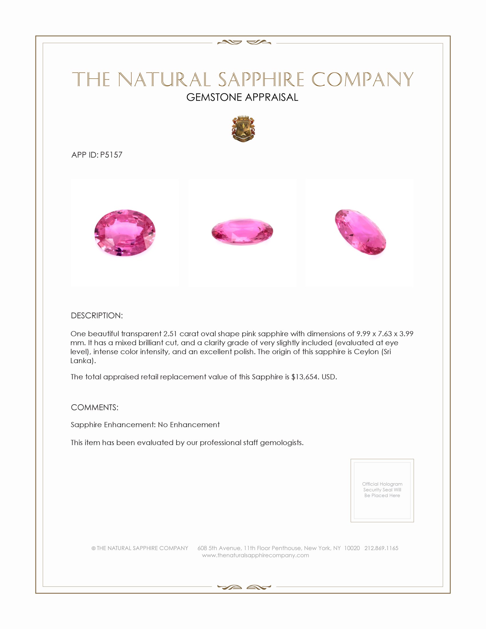 Ceylon has been renowned for centuries as a source of the world's most exquisite sapphires, and this gemstone continues that storied tradition. Traditionally utilized by royalty and nobility, sapphires from this region have symbolized power, wisdom, and wealth, making them a cherished part of royal regalia. Throughout history, Ceylon sapphires have been desired for their stunning hues and exceptional durability. Our pink sapphire carries this esteemed legacy, promising to preserve its radiant aura and elegance over generations. This gem’s intense color intensity is a reflection of the top-tier quality sapphires originating from Ceylon, unparallelled and preserved by The Natural Sapphire Company's commitment to excellence.