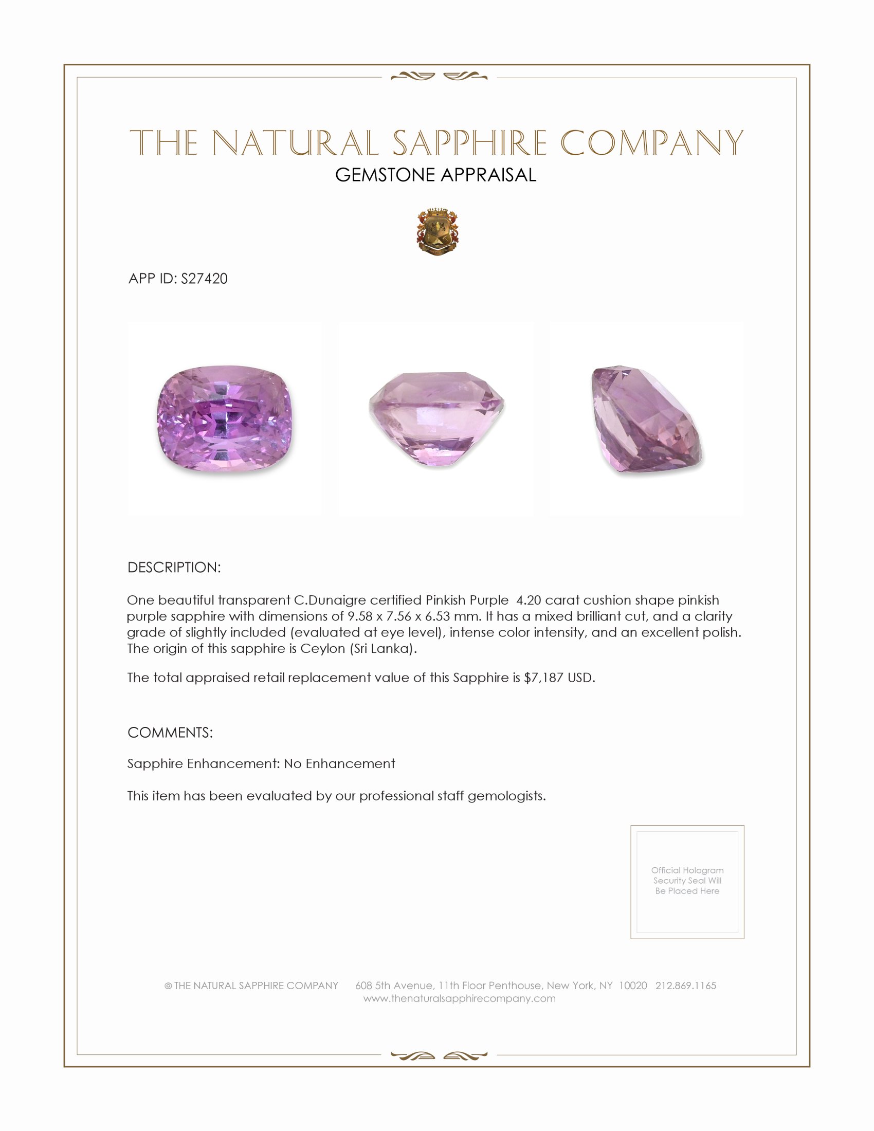Introducing a gemstone of exceptional allure, the pinkish purple sapphire certified by C.Dunaigre. With a substantial weight of 4.20 carats, this exquisite stone showcases a cushion shape and is distinguished by its remarkable dimensions of 9.58 x 7.56 x 6.53 mm. Its mixed brilliant cut brings forth a sparkling display that radiates its inherent beauty, while its clarity grade, slightly included when evaluated at eye level, underscores its organic authenticity. The gemstone's intense color intensity offers a vibrant hue that immediately captures attention. Coupled with its excellent polish, this sapphire from The Natural Sapphire Company exemplifies the pinnacle of nature's artistry in gemstone form.