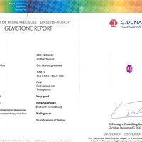 Discover a treasure that speaks to the soul with our breathtaking 4.52-carat oval-shaped pink sapphire. Certified by the esteemed C.Dunaigre, this gemstone is more than just a piece of jewelry. It's a radiant token of beauty and love. Its allure lies in the vivid hue that dances with each ray of light. Imagine capturing the essence of a delicate dawn, where the sky is painted in soft pinks and tender warmth. This exquisite stone beckons to the heart with its graceful brilliance, creating a symphony of joy and elegance that words can scarcely capture.