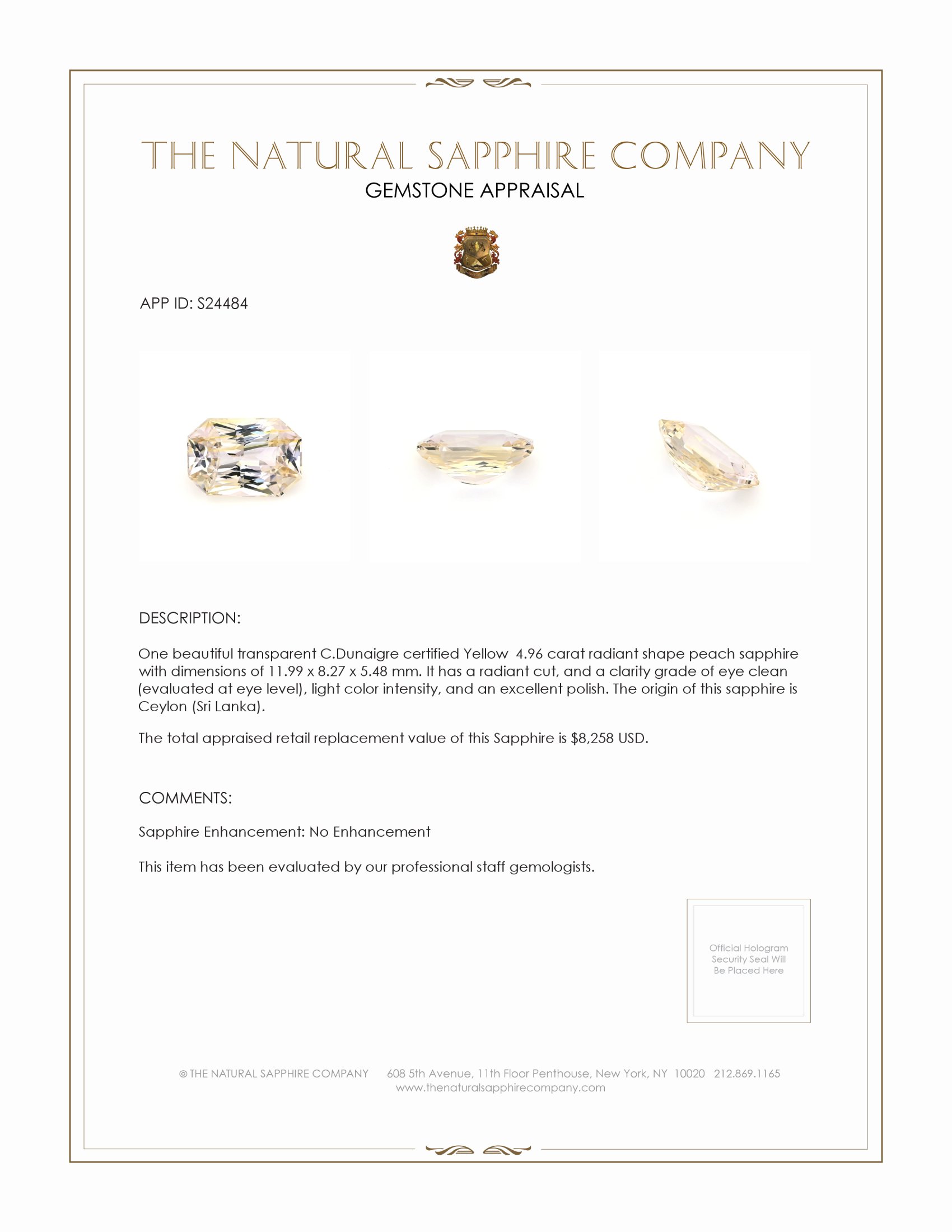 The centerpiece of any fine jewelry collection, this exquisite peach sapphire is a rare gem that captivates with its stunning beauty and exceptional characteristics. Certified by the renowned C. Dunaigre laboratory, this radiant shape gemstone boasts a substantial carat weight of 4.96, making it a significant treasure for discerning buyers who value authenticity and precision in grading. Each facet of this sapphire, with dimensions of 11.99 x 8.27 x 5.48 mm, has been cut to perfection, allowing light to reflect brilliantly across its surface. This expert craftsmanship is evident in the gemstone's radiant cut, a design choice that enhances the stone’s natural luster and maximizes its brilliance, especially under natural light.