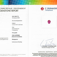 Imagine the moment you lay eyes on a captivating gem that takes your breath away, evoking a sense of wonder and delight. This beautiful transparent C. Dunaigre certified 5.16-carat oval shape pink sapphire is a treasure from nature's most enchanting garden. With dimensions of 11.57 x 9.39 x 5.62 mm, it is a masterpiece of its kind, a rare gem that speaks directly to the heart. At The Natural Sapphire Company, we believe in connecting you with exquisite gemstones that not only sparkle with beauty but also resonate deeply on an emotional level.