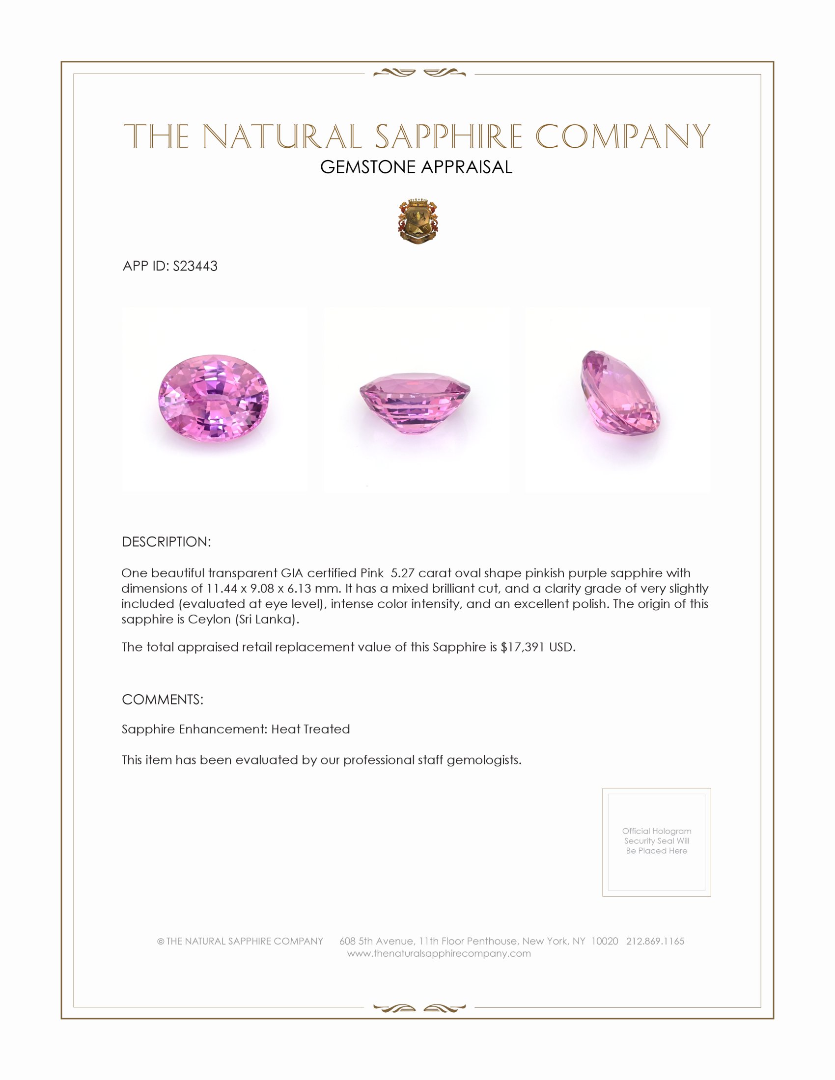 Discover a gem that surpasses the ordinary, revealing a world of vibrant color and exceptional brilliance. Introducing a truly magnificent 5.27 carat oval-shaped pinkish purple sapphire, certified by the prestigious Gemological Institute of America. This sapphire, with its dimensions of 11.44 x 9.08 x 6.13 mm, is not just a gemstone but an extraordinary treasure. Hand-selected by The Natural Sapphire Company for its impressive mix of natural beauty and exquisite craftsmanship, this sapphire stands poised to fulfill your quest for unparalleled elegance.