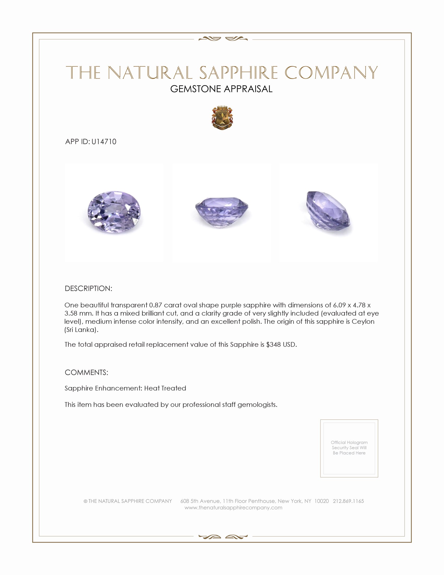 In the world of fine gemstones where timeless beauty meets unparalleled sophistication, the exquisite 0.87 carat oval-shaped purple sapphire stands as a beacon of luxury and impeccable taste. Originating from the storied lands of Ceylon, now known as Sri Lanka, this gemstone embodies a rich heritage of meticulous craftsmanship and centuries-old tradition. With dimensions of 6.09 x 4.78 x 3.58 mm, this sapphire is a testament to nature's artistry, drawing admirers with its alluring hue that whispers of twilight skies and whispering violets, making it a rare and desirable treasure for any connoisseur of fine jewelry.