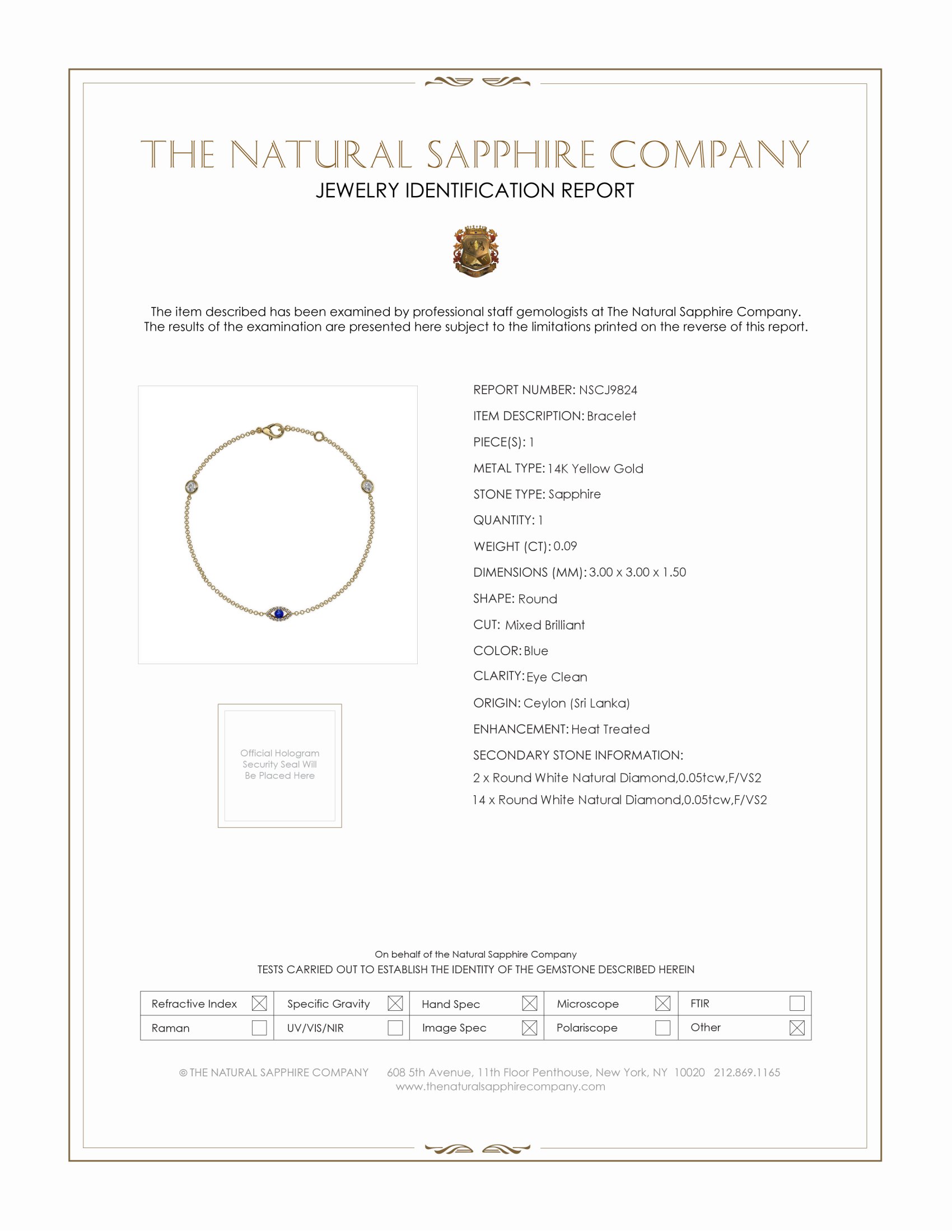 This exquisite bracelet is a testament to classic elegance and timeless design, masterfully crafted in radiant 14K yellow gold. The piece is centered around a captivating blue Sapphire, which is the heart of this sophisticated accessory. The Sapphire, weighing 0.09 carats, boasts a round shape with a mixed brilliant cut, offering a breathtaking sparkle. This gem measures 3.00 x 3.00 x 1.50 mm and is characterized by its clarity, being deemed eye clean when evaluated at eye level. The stone's color intensity is vivid, a testament to its high quality, and it enjoys an excellent polish that enhances its luster. Originating from the renowned mines of Ceylon (Sri Lanka), this blue Sapphire carries with it a legacy of the island's famed gemstone history.Adorning the bracelet alongside the centerpiece are two white round-shaped Diamonds with a brilliant cut, collectively weighing 0.11 carats. These Diamonds are distinguished by their VS2 clarity grade—indicating very slight inclusions thats are not readily visible to the naked eye—and they exhibit an F color rating, which places them at the higher end of the colorlessness scale, ensuring a dazzling display of fire and brilliance.Further embellishing the design, 16 additional white round-shaped brilliant cut Diamonds gracefully encrust the bracelet. Combined, they contribute an extra 0.12 carats to the piece, matching the clarity and color grades of VS2 and F respectively, of the two larger Diamonds. This constellation of Diamonds not only enhances the bracelet's shine but also frames the central Sapphire with a halo of light, creating an enchanting contrast against the yellow gold setting.The entire assembly reflects sophisticated craftsmanship, a design that transcends time with its elegance. Such a bracelet is not merely an accessory; it is a versatile piece suitable for various occasions, from formal events to casual gatherings. The wearer of this bracelet will enjoy the combined beauty of luxurious Sapphire and the twinkling dance of top-grade Diamonds, all harmoniously set in the warmth of 14K yellow gold. The bracelet promises to be an heirloom, cherished for generations to come.