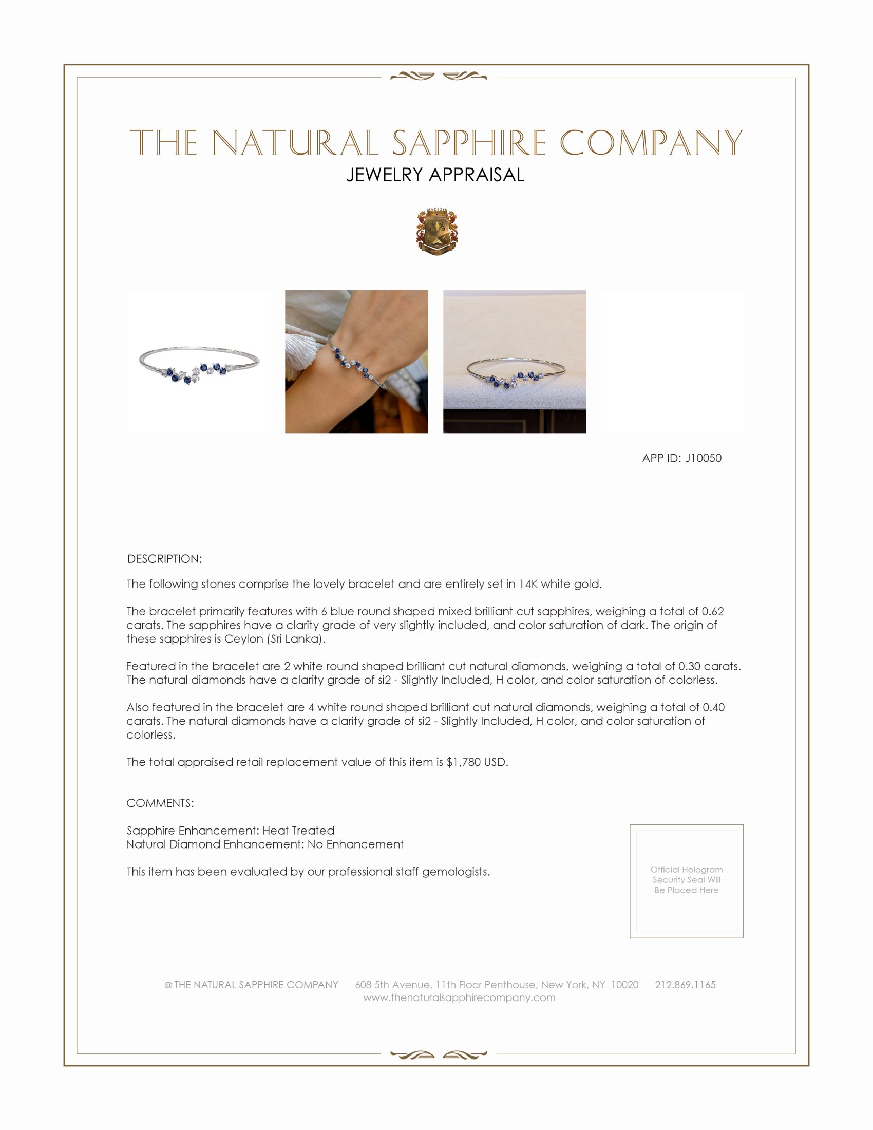 The bracelet crafted by The Natural Sapphire Company exemplifies meticulous attention to detail and timeless elegance, set entirely in 14K white gold. It predominantly features six blue round-shaped mixed brilliant cut sapphires, which weigh a total of 0.62 carats. With a clarity grade of very slightly included and exhibiting dark color saturation, the sapphires hail from the famed gem-rich region of Ceylon, Sri Lanka. These sapphires are renowned for their deep blue hue, a hallmark of Ceylon quality, imparting a classic yet vibrant appeal that underscores the bracelet's luxurious nature.
