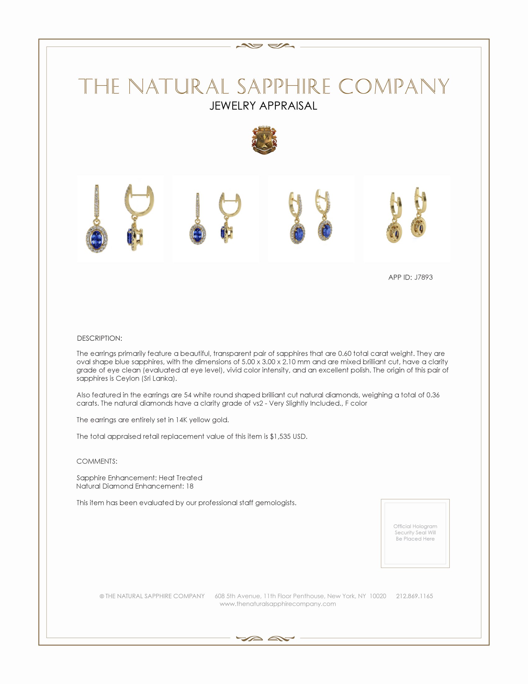 The Natural Sapphire Company proudly presents a pair of exquisite earrings that epitomizes a perfect blend of elegance and craftsmanship. The central focus of these earrings is the beautiful pair of transparent Sapphires, sourced from the renowned gemstone region of Ceylon in Sri Lanka. Each sapphire is masterfully cut into an oval shape with dimensions measuring 5.00 x 3.00 x 2.10 mm, resulting in a total carat weight of 0.60. The mixed brilliant cut enhances their brilliance, while the vivid blue color intensity captures attention with its striking allure. These gemstones possess a clarity grade of eye clean, ensuring that each sapphire is free from inclusions visible to the naked eye. Further accentuating their beauty, the sapphires have undergone heat treatment—a standard enhancement technique to optimize color and clarity—without compromising their intrinsic quality.