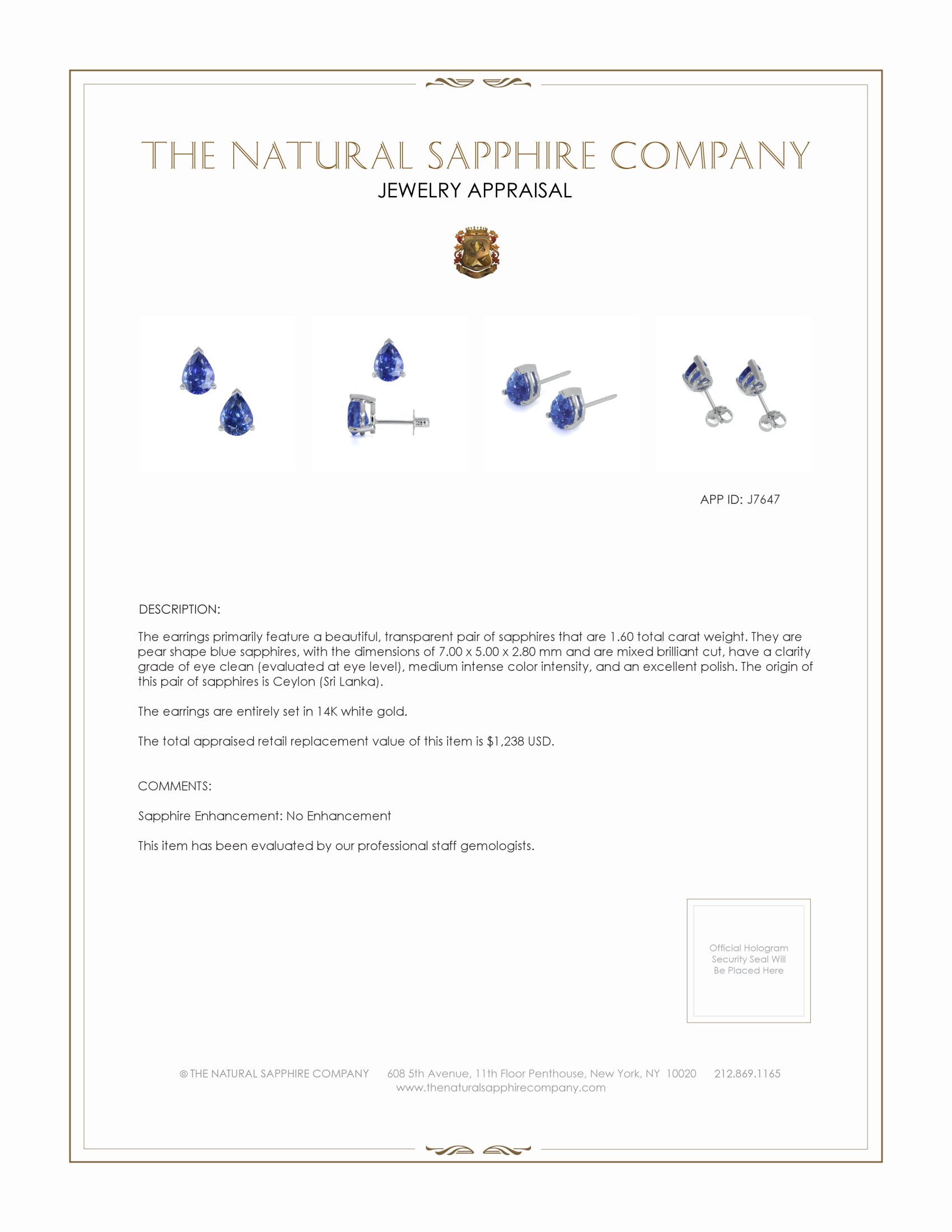 In a world where dreams are cradled softly in whispers of sapphire skies and the gentle glow of morning dew, The Natural Sapphire Company unveils a masterpiece of ethereal beauty and profound elegance. Each time-honored tradition of skillful craftsmanship breathes life into these exquisite earrings, where romance and sustainability become intertwined like the branches of a timeless love story. The heart of this creation is a luminous, pear-shaped pair of Sapphires, drawn from the very soul of Ceylon, where the land's blessings run deep within each glimmer of blue.