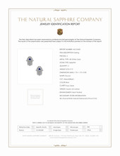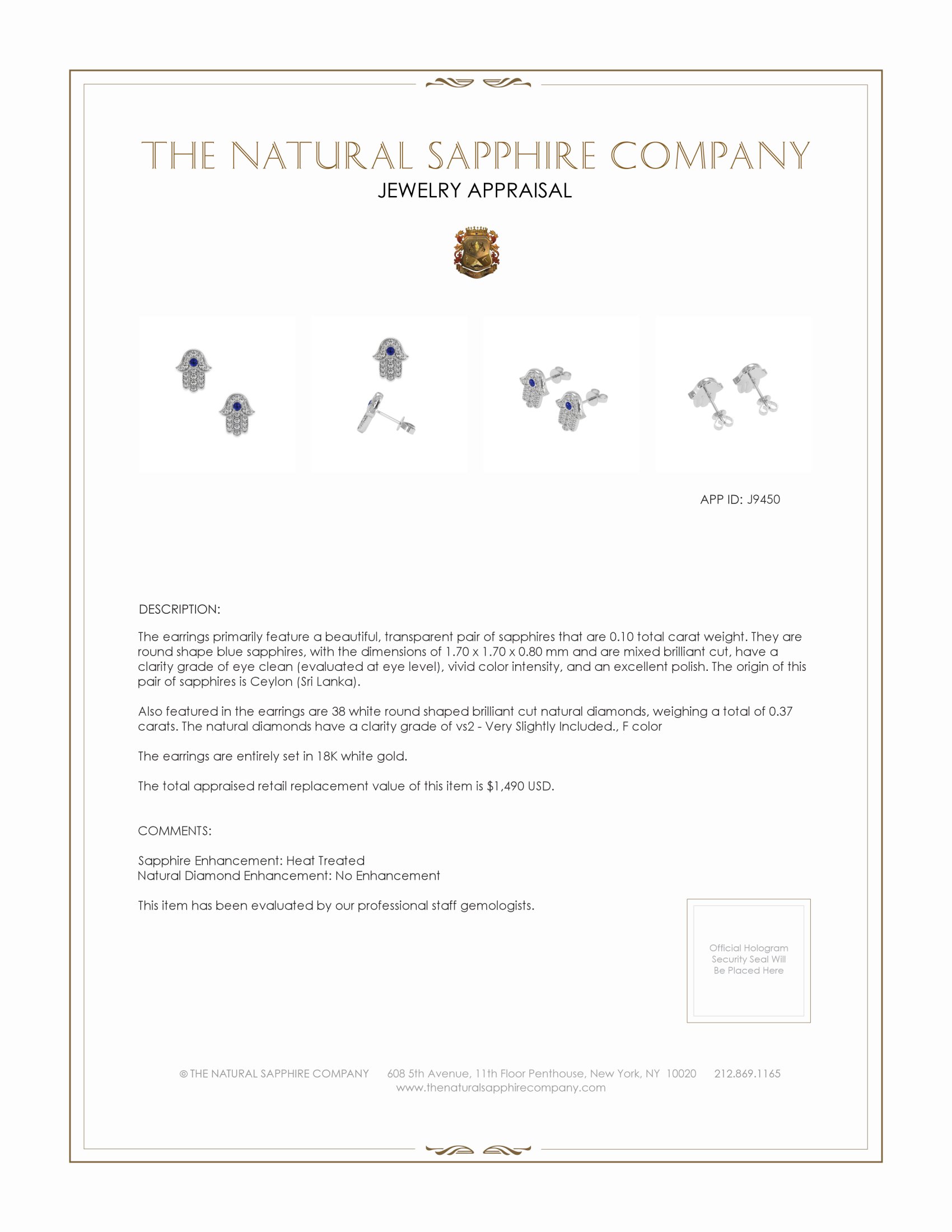 The earrings primarily feature a beautiful, transparent pair of sapphires that are 0.10 total carat weight. They are round shape blue sapphires, with the dimensions of 1.70 x 1.70 x 0.80 mm and are mixed brilliant cut, have a clarity grade of eye clean (evaluated at eye level), vivid color intensity, and an excellent polish. The origin of this pair of sapphires is Ceylon (Sri Lanka). Also featured in the earrings are 38 white round shaped brilliant cut natural diamonds, weighing a total of 0.37 carats. The natural diamonds have a clarity grade of vs2 - Very Slightly Included., F color The earrings are entirely set in 18K white gold.