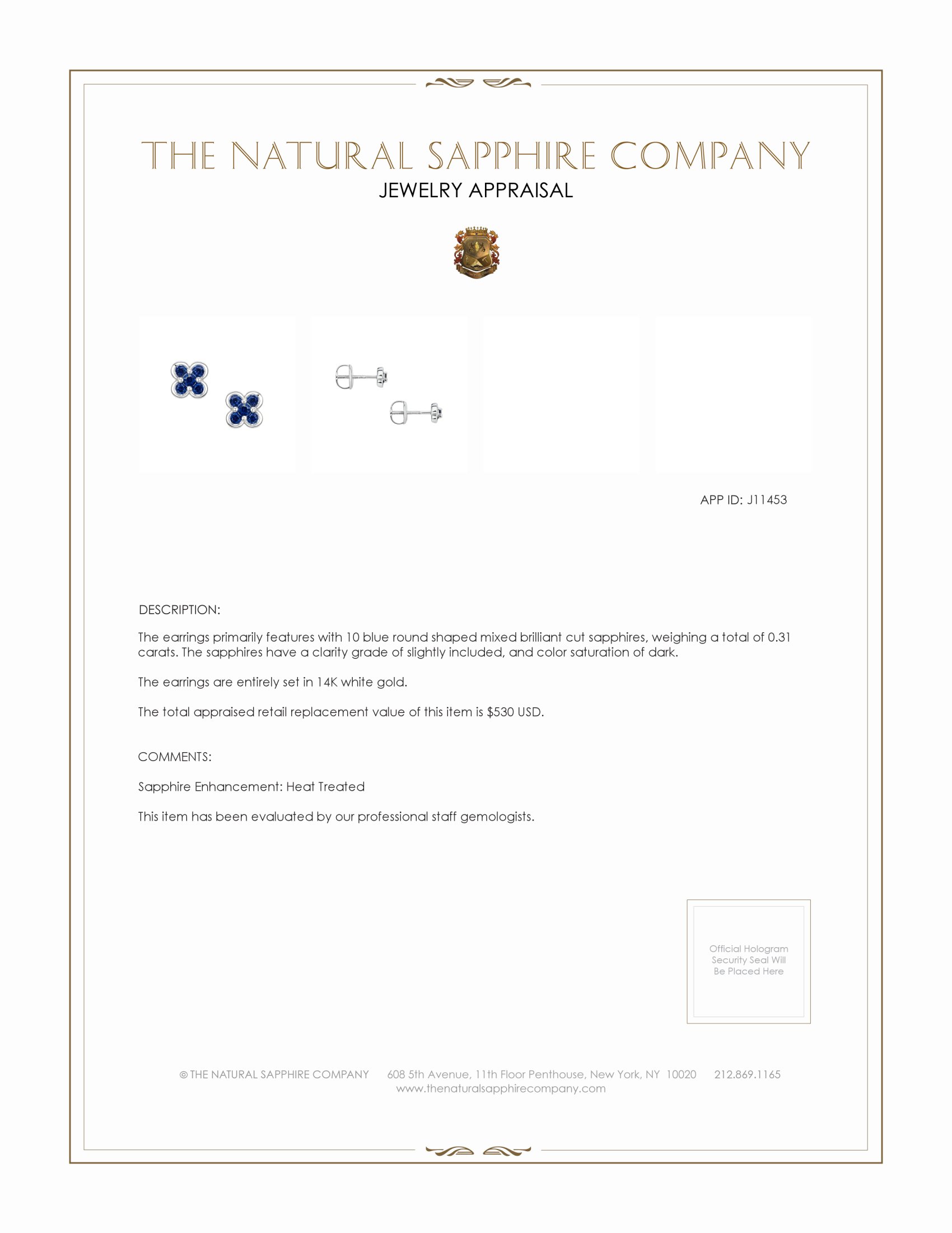 Imagine the moment you lift the lid of a small jewelry box and see a pair of earrings that seem to hold a midnight sky within them, a surprise that stops time for a heartbeat. These delicate studs are entirely set in 14K white gold, each one shaped like a gentle four petal cluster, the petals formed from four perfectly paired deep blue sapphires that sparkle with a cool and radiant fire. Picture the soft light catching the facets just so, sending tiny stars of blue across her cheek, the kind of light that makes ordinary moments feel like carefully written chapters in a love story. Giving these earrings is more than presenting a gift, it is giving a keepsake that will be worn as a memory, a small luminous promise that will be seen and felt every time she wears them.