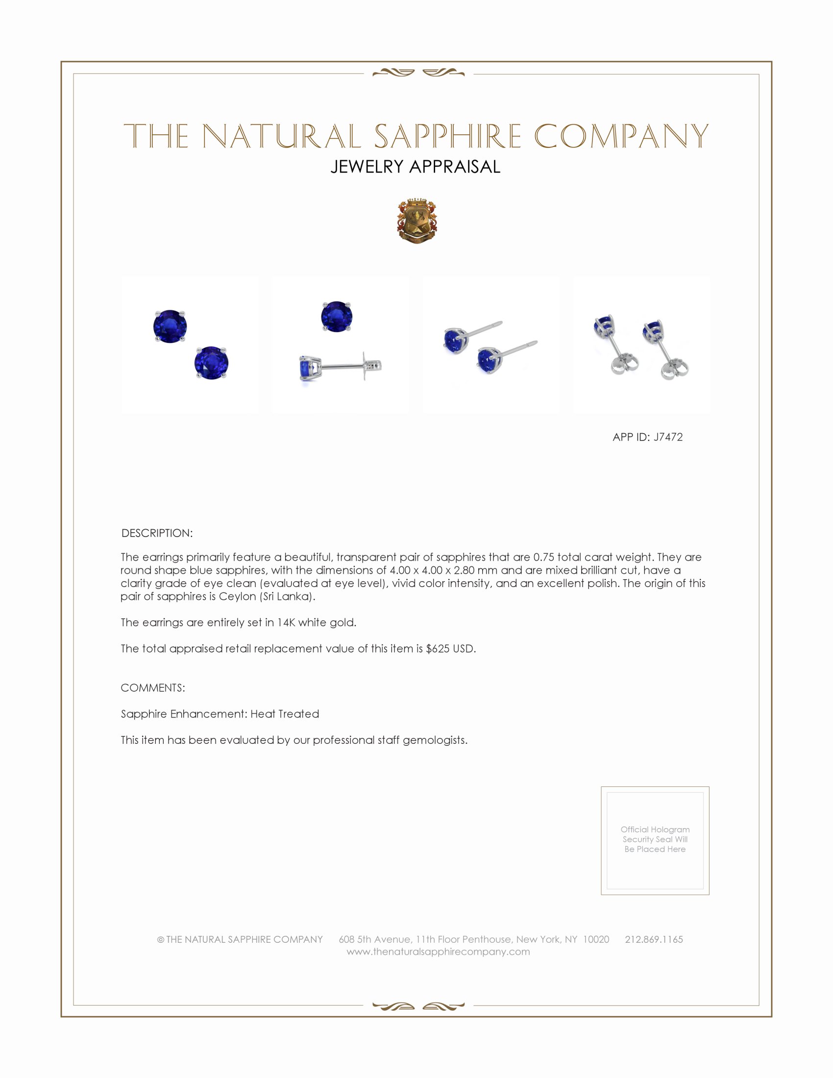 In the heart of each earring lies a story that stretches back through time, a tale told by nature herself. The centerpiece of these exquisite earrings are two remarkable sapphires, individually enthralling with their vibrant blue hues. These stunning gemstones, originating from the ancient and revered lands of Ceylon, now known as Sri Lanka, are cut in a round brilliant style, measuring 4.00 x 4.00 x 2.80 mm. At a total carat weight of 0.75, each sapphire in this pair has been meticulously selected for its eye-clean clarity and vivid color intensity, to ensure the highest quality and bring to life the legacy of the land from which they were unearthed.