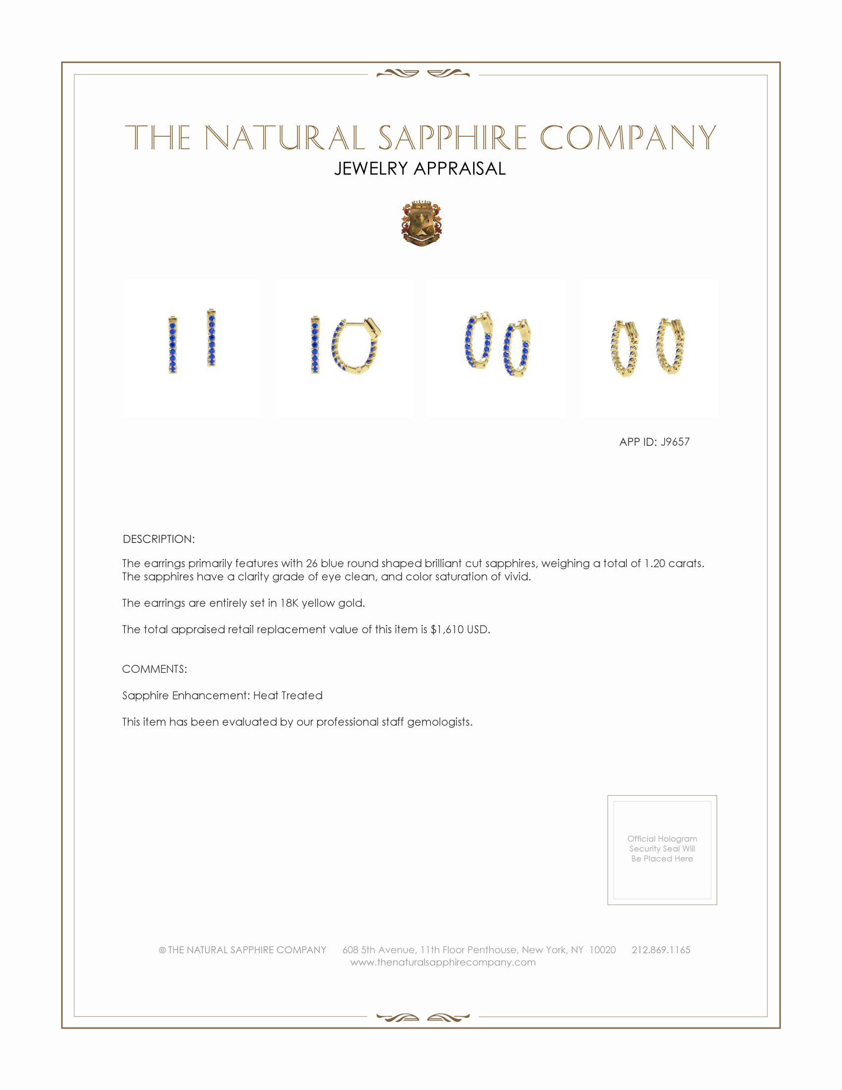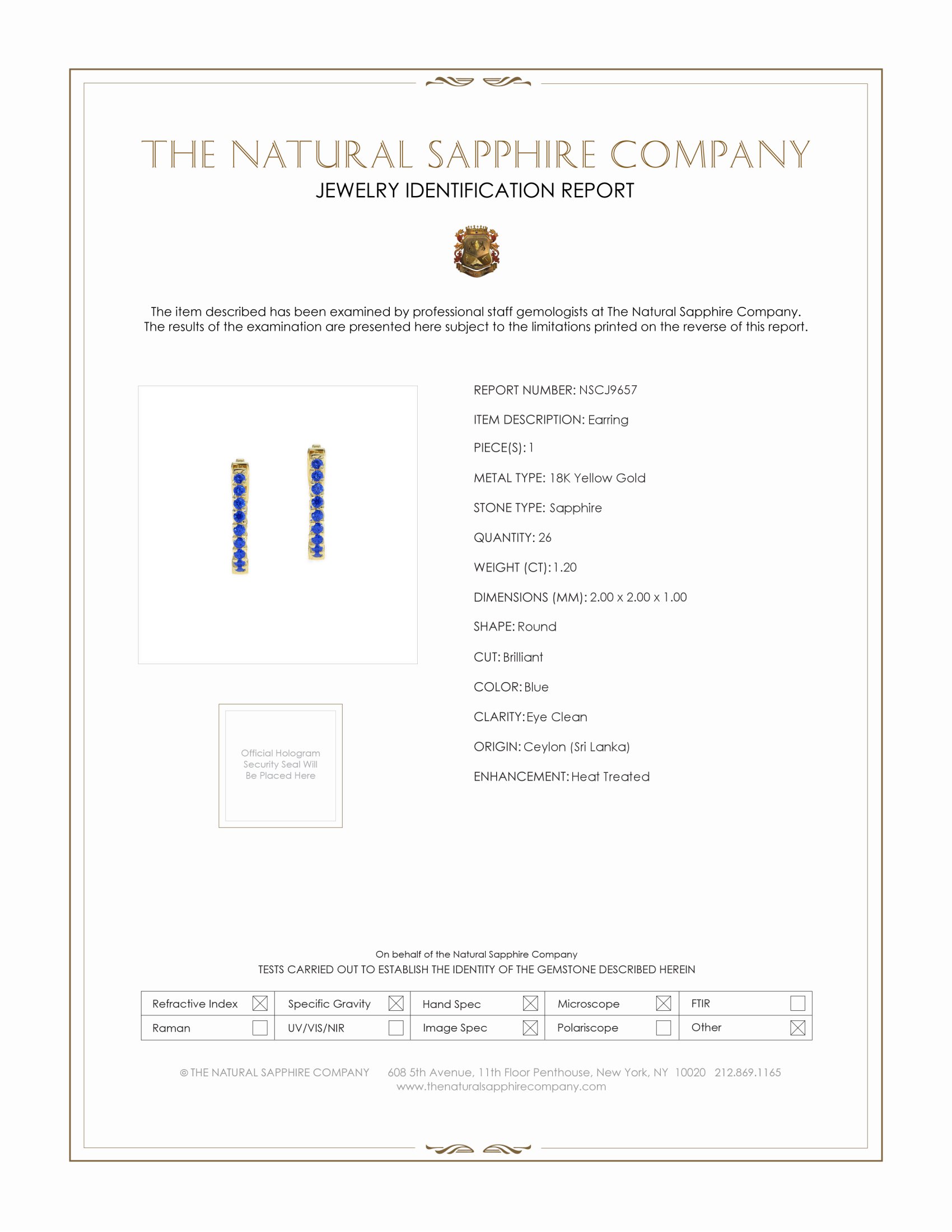 Drenched in elegance and poised with regality, these earrings encapsulate the enchanting allure of the deep blue seas with their 26 round-shaped brilliant cut sapphires. Sourced from the historic gem mines of Ceylon (Sri Lanka), these sapphires exude a vivid color intensity that is bound to mesmerize any beholder. Weighing a collective 1.20Ct, each gem is meticulously cut to ensure optimal sparkle and is graded eye clean, reflecting their impeccable clarity. With dimensions of 2.00L x 2.00W x 1.00H mm, the sapphires showcase their magnificence without being overpowering, capturing the essence of sophistication and charm.