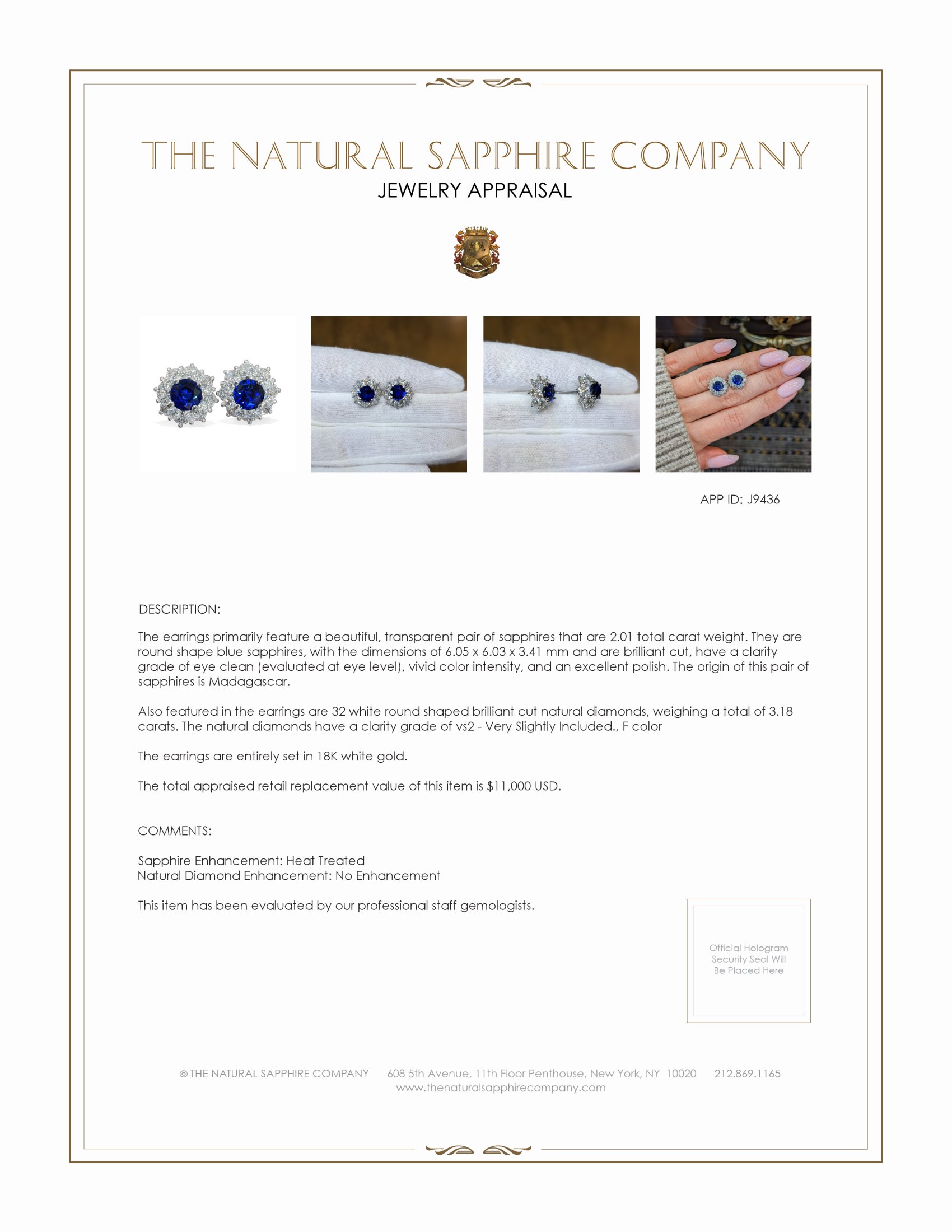 Immerse yourself in the enchanting world of unparalleled beauty with these exquisite earrings, featuring a magnificent pair of transparent blue sapphires from the captivating mines of Madagascar. With a total carat weight of 2.01, these round-shaped sapphires, measuring 6.05 x 6.03 x 3.41 mm, exude brilliance and sophistication.