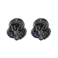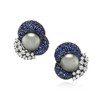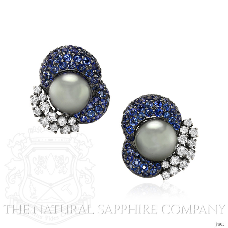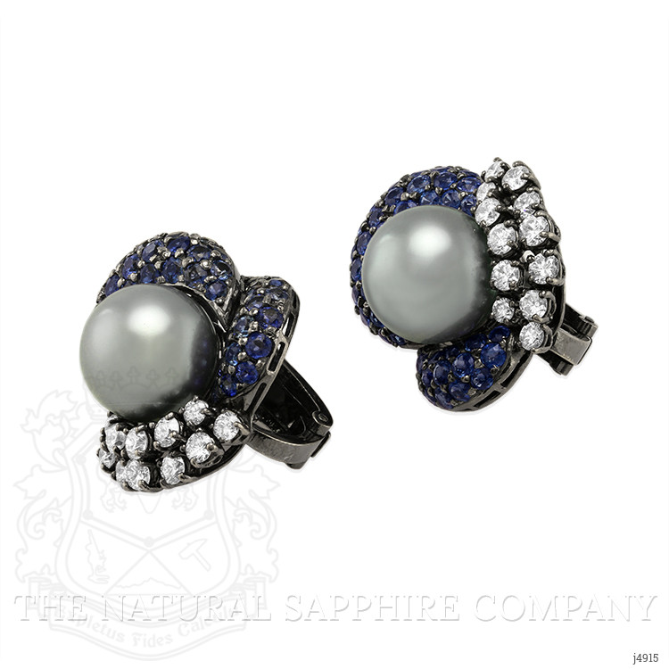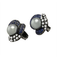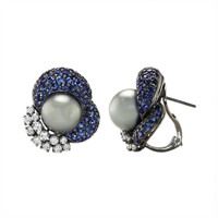 For pearl lovers, there’s nothing quite as captivating as the dark and iridescent Tahitian pearl. Commonly known as the “black pearl,” these exotic gems, cultivated in the lagoons of French Polynesia in the South Pacific, have become the fancy of royalty and the fashion world alike for their dramatic appeal. Here the “Queen of Pearls” plays the star in a pair of blackened 18-karat white gold ear clips, nestled among swirls of micropavé-set bright blue sapphires and round-cut diamonds. The ear clips contain a post for pierced ears, while the tension mechanism holds them in place for additional comfort and security.