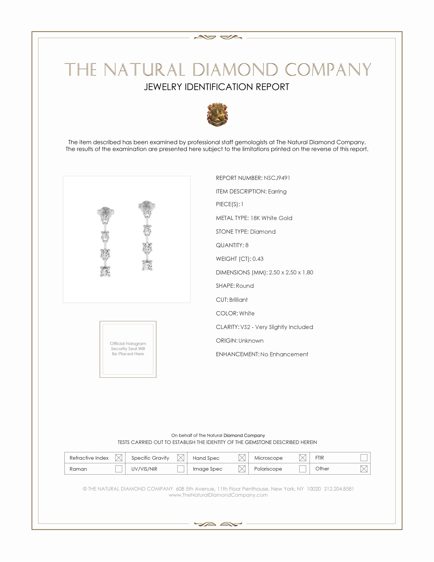 Experience elegance redefined with our pair of earrings, a true testament to timeless sophistication. Crafted with precision and passion, these earrings are designed for those who cherish the understated allure of classic beauty. At their core, they are graced by eight luminescent white diamonds, each round in shape and brilliantly cut to capture and reflect light in a dance of shimmer and shine. Together, they weigh a significant 0.43Ct, ensuring that their presence, though subtle, does not go unnoticed. With dimensions of 2.50 x 2.50 x 1.80 mm, these diamonds offer a radiance that's heightened by their clarity grade of VS2 - Very Slightly Included, ensuring minimal inclusions and maximum brilliance.