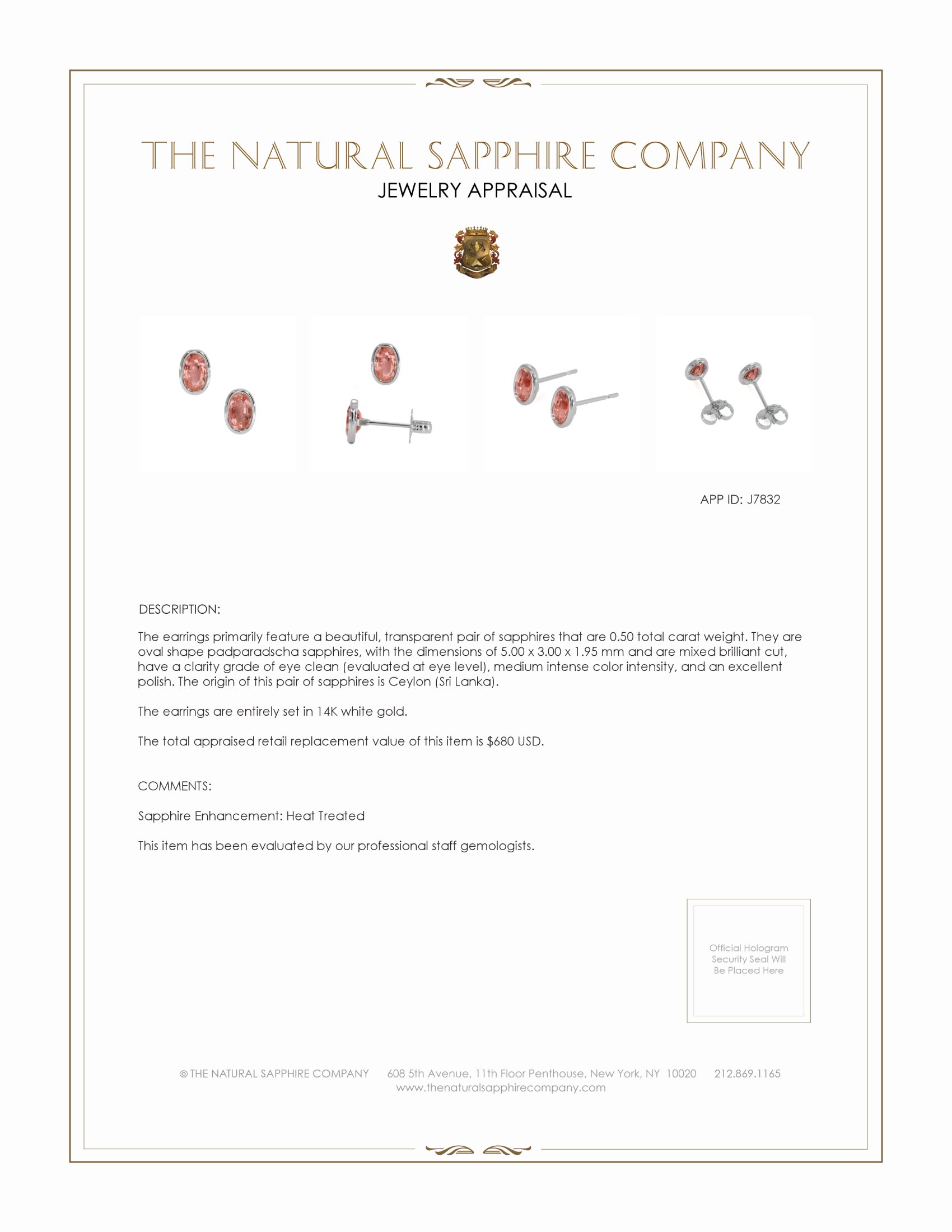 Originating from the storied lands of Ceylon, now known as Sri Lanka, the padparadscha sapphires in these earrings carry with them a rich tapestry of cultural significance and ancient tradition. With a total carat weight of 0.50, each sapphire has been masterfully cut into an oval shape, measuring 5.00 x 3.00 x 1.95 mm. Their mixed brilliant cut ensures a dazzling display of light and scintillation, capturing the eye with every movement. With a clarity grade of eye clean and a medium intense color that dances between delicate sunset hues, these sapphires evoke the serene beauty of a tranquil evening sky. Enhanced by heat treatment to bring out their optimal hue, they are a burst of warmth and radiance that echoes the vivid landscape of their origin.
