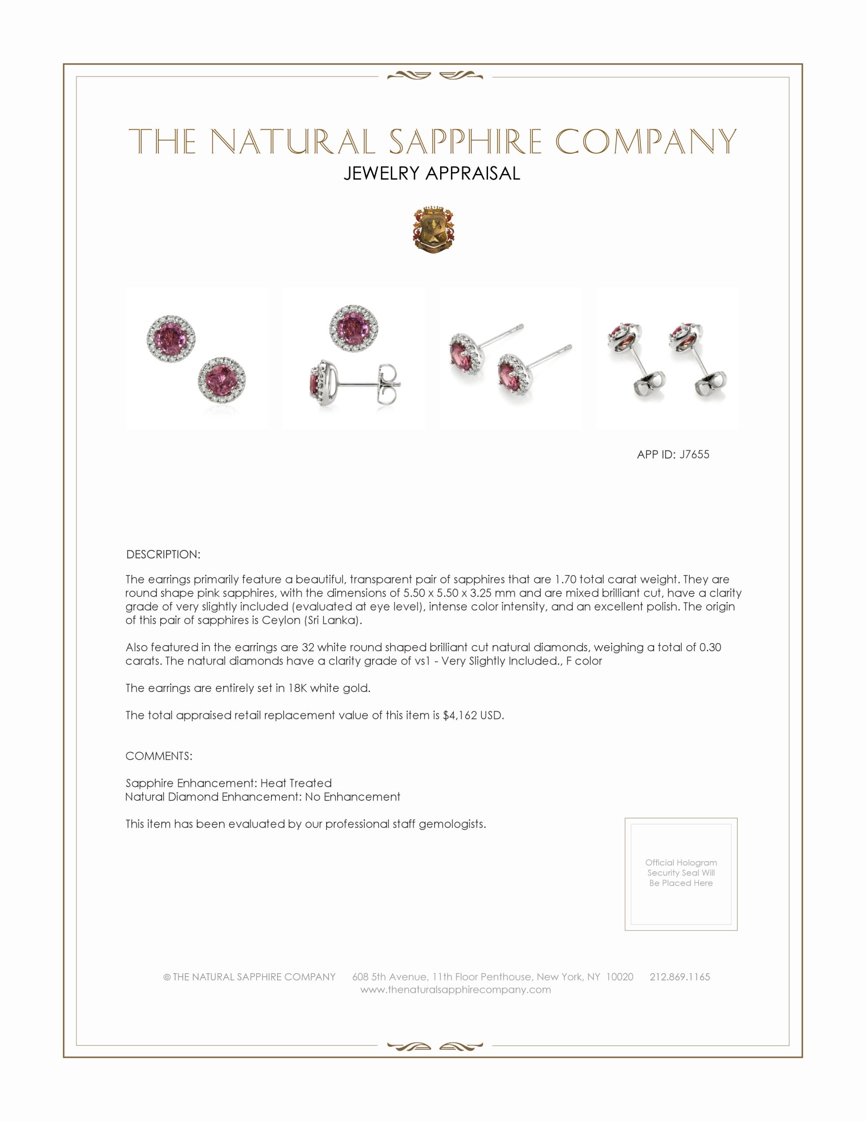 These exquisite earrings are a perfect blend of elegance and sophistication, crafted for those who appreciate the finer things in life. At the heart of their design lies a captivating pair of pink sapphires, which weigh a combined 1.70Ct. These round-shaped sapphires, with dimensions of 5.50 x 5.50 x 3.25 mm, have been meticulously fashioned into a mixed brilliant cut. Their intense pink hue, accentuated by an excellent polish, captures the light in a mesmerizing dance. Although they possess a clarity grade of very slightly included, it does little to diminish their radiant beauty. These sapphires hail from Ceylon (Sri Lanka), a region famed for producing some of the world's most coveted gemstones.
