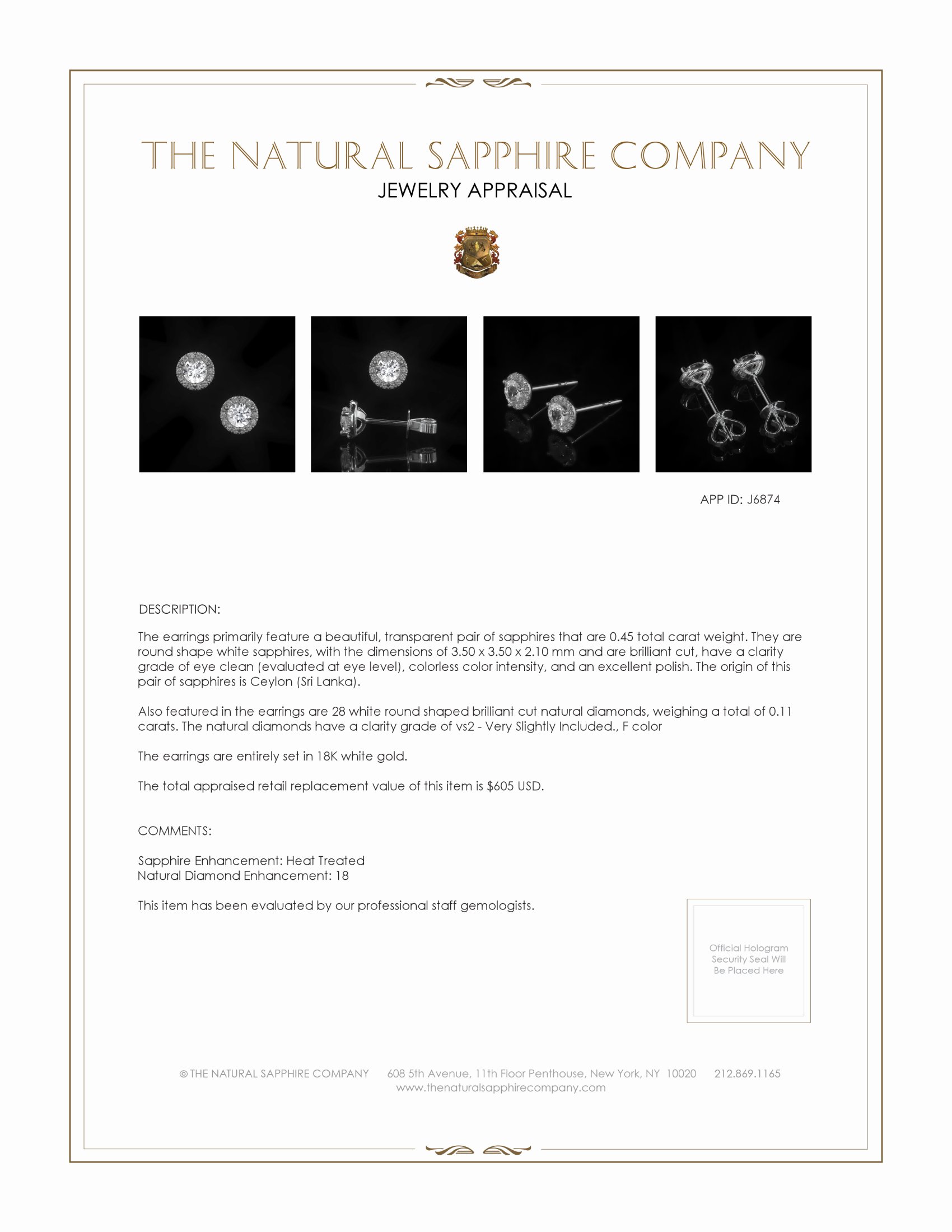 In the gentle whispers of twilight, where dreams begin to weave their tapestry of wonder, lie a pair of earrings so exquisite they seem born from the delicate dance of starlight and moonbeams. These are not mere adornments but the embodiment of love’s glow, a testament to the timeless allure that only nature can bestow. At the heart of these earrings, two shimmering white sapphires beckon like ethereal eyes, drawing you deeper into the magical landscape of romance. Each gem, a 0.45 total carat weight, possesses a clarity that rivals the crystalline waters of a serene lake, with dimensions of 3.50 x 3.50 x 2.10 mm, they exude a quiet yet potent beauty that captivates the soul. Their brilliance cut set ablaze by masterful craftsmanship invites a radiant glow that is both intimate and profound. Heated to their peak, these sapphires from the distant lands of Ceylon tell stories only eons know, whispering secrets into your ear with each graceful turn of the head.