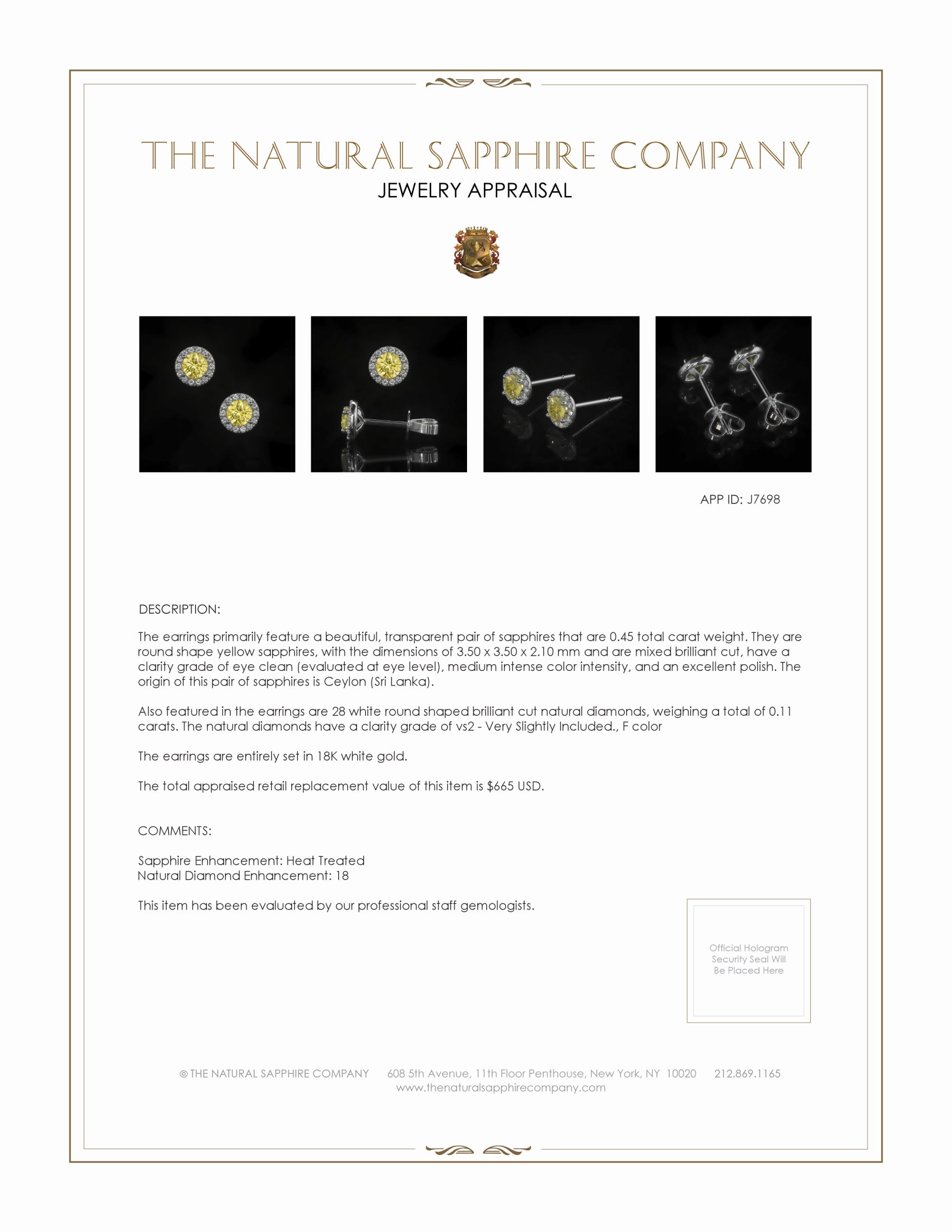At the center of these stunning earrings lie two magnificent yellow sapphires. These gems, originating from the esteemed region of Ceylon, Sri Lanka, boast a total carat weight of 0.45. With dimensions of 3.50 x 3.50 x 2.10 mm, these mixed brilliant cut sapphires possess a clarity grade of eye clean, ensuring a flawless appearance to the naked eye. Their medium intense color radiates warmth and brilliance, while an excellent polish enhances their captivating sparkle. To maximize their visual appeal, these sapphires have been carefully heat treated, a process that further intensifies their vibrant hue.