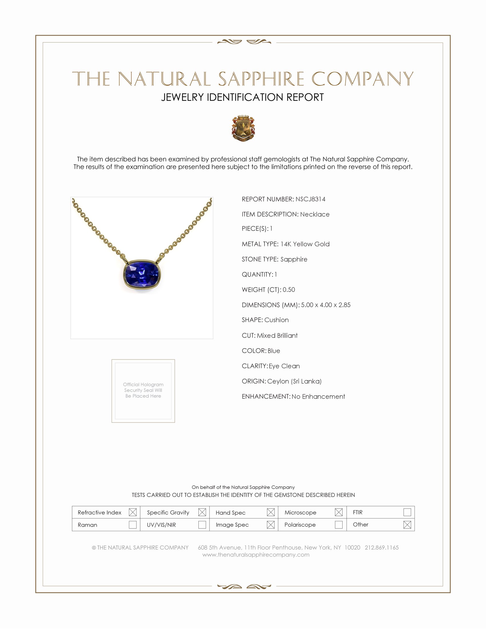 The sophisticated design of this exquisite necklace is a testament to the meticulous craftsmanship exhibited by The Natural Sapphire Company. Central to this magnificent creation is a 0.50-carat cushion-shaped blue Sapphire, securely nestled within a setting of 14K yellow gold. The Sapphire's dimensions of 5.00 x 4.00 x 2.85 mm reveal an exceptional balanced structure, combined with a mixed brilliant cut that maximizes its inherent sparkle. Originating from the renowned gemstone region of Ceylon, Sri Lanka, this Sapphire is of impeccable pedigree, chosen for its unenhanced vivid color intensity and remarkable transparency.