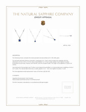 The following stones comprise the lovely pendant and are entirely set in 18K white gold. The pendant primarily features a beautiful, transparent 0.61 carat cushion shape blue sapphire with the dimensions of 5.65 x 4.99 x 2.13 mm and is mixed brilliant cut. It has a clarity grade of very slightly included (evaluated at eye level), intense color intensity, and an excellent polish. The origin of this sapphire is Ceylon (Sri Lanka). Also featured in the pendant are 27 white round shaped mixed brilliant cut natural diamonds, weighing a total of 0.37 carats. The natural diamonds have a clarity grade of vvs1 - Very Very Slightly Included., F color