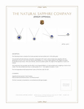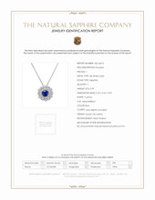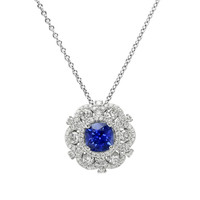 The following stones comprise the lovely pendant and are entirely set in 18K white gold. The pendant primarily features a beautiful, transparent 0.99 carat cushion shape blue sapphire with the dimensions of 5.64 x 5.63 x 3.92 mm and is mixed brilliant cut. It has a clarity grade of very slightly included (evaluated at eye level), vivid color intensity, and an excellent polish. The origin of this sapphire is Ceylon (Sri Lanka). Also featured in the pendant are 84 white round shaped brilliant cut natural diamonds, weighing a total of 0.65 carats. The natural diamonds have a clarity grade of vs1 - Very Slightly Included., F color