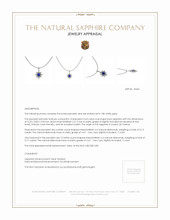 The following stones comprise the lovely pendant and are entirely set in 18K white gold. The pendant primarily features a beautiful, transparent 0.43 carat oval shape blue sapphire with the dimensions of 5.23 x 3.83 x 2.50 mm and is mixed brilliant cut. It has a clarity grade of slightly included (evaluated at eye level), intense color intensity, and an excellent polish. The origin of this sapphire is Ceylon (Sri Lanka). Featured in the pendant are 4 white round shaped mixed brilliant cut natural diamonds, weighing a total of 0.12 carats. The natural diamonds have a clarity grade of vvs1 - Very Very Slightly Included., F color Also featured in the pendant are 12 white round shaped mixed brilliant cut natural diamonds, weighing a total of 0.17 carats. The natural diamonds have a clarity grade of vvs1 - Very Very Slightly Included., F color