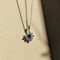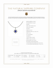 The following stones comprise the lovely pendant and are entirely set in 18K white gold. The pendant primarily features a beautiful, transparent 0.43 carat oval shape blue sapphire with the dimensions of 5.23 x 3.83 x 2.50 mm and is mixed brilliant cut. It has a clarity grade of slightly included (evaluated at eye level), intense color intensity, and an excellent polish. The origin of this sapphire is Ceylon (Sri Lanka). Featured in the pendant are 4 white round shaped mixed brilliant cut natural diamonds, weighing a total of 0.12 carats. The natural diamonds have a clarity grade of vvs1 - Very Very Slightly Included., F color Also featured in the pendant are 12 white round shaped mixed brilliant cut natural diamonds, weighing a total of 0.17 carats. The natural diamonds have a clarity grade of vvs1 - Very Very Slightly Included., F color