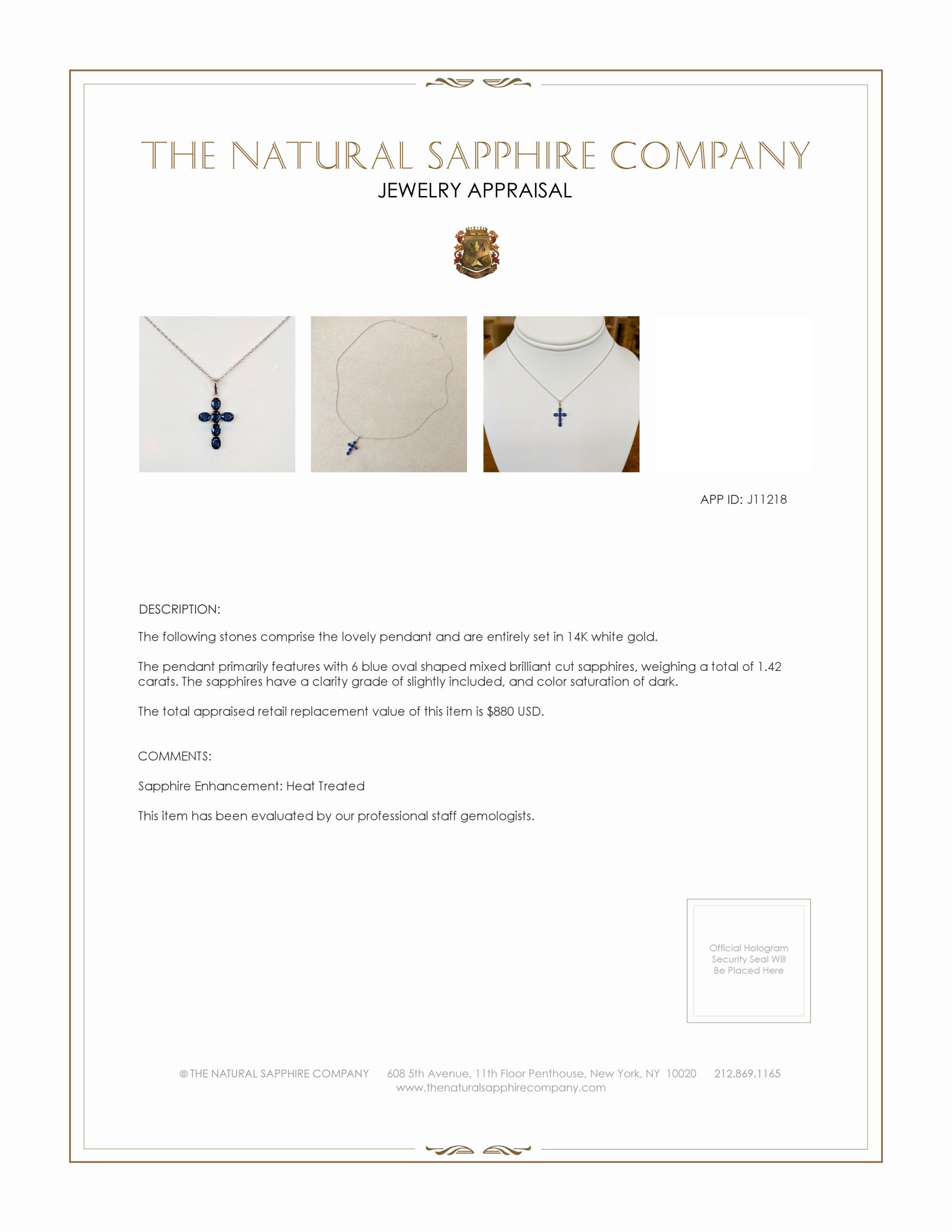 The epitome of sophistication, this stunning pendant masterfully combines premium craftsmanship with timeless elegance. At its heart are five meticulously selected sapphires, each delicately set to form a classic cross design. Sapphires, renowned for their durability and enchanting deep blue hue, are precisely faceted to maximize their brilliance and depth. Each gemstone is cut in an oval shape, a decision that allows for greater interaction with light, amplifying their natural sparkle. The deep royal blue is complemented beautifully by the 14K white gold setting, accentuating the clarity and intensity of the stones. This piece exemplifies superior craftsmanship, ensuring it appeals to those with refined taste who appreciate attention to detail and quality.