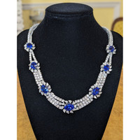 The necklace features a stunning arrangement of vibrant blue sapphires, each precisely hand-cut into oval shapes to maximize their depth of color and brilliance. The sapphires exhibit a magnificent royal blue hue, grading high on the color scale for these precious gems. Complementing the vivid sapphires are delicate diamonds, each expertly cut to round brilliant perfection—a technique that enhances their fire and scintillation. The seamless craftsmanship involved ensures that every facet catches the light, radiating a breathtaking sparkle that is sure to captivate attention.