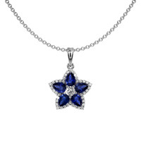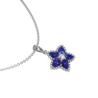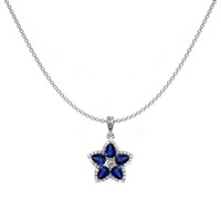 “Blue thou art, intensely blue; Flower, whence came thy dazzling hue?" -James Montgomery. If only this distinguished British poet, who died in 1854, had the opportunity to present his inquiry to this remarkable sapphire and diamond pendant set in 14K white gold. Perhaps he would receive an answer. The blossom’s center, comprised of high quality F color diamonds from Israel, is surrounded by five natural heat treated pear shaped blue sapphires from Ceylon. Encircling the petals is a vibrant halo of matching diamond rounds. The flower upon which he based his poem more than a century and a half ago must have been very much like this lovely pendant for they are both timeless and a wonder to behold.
