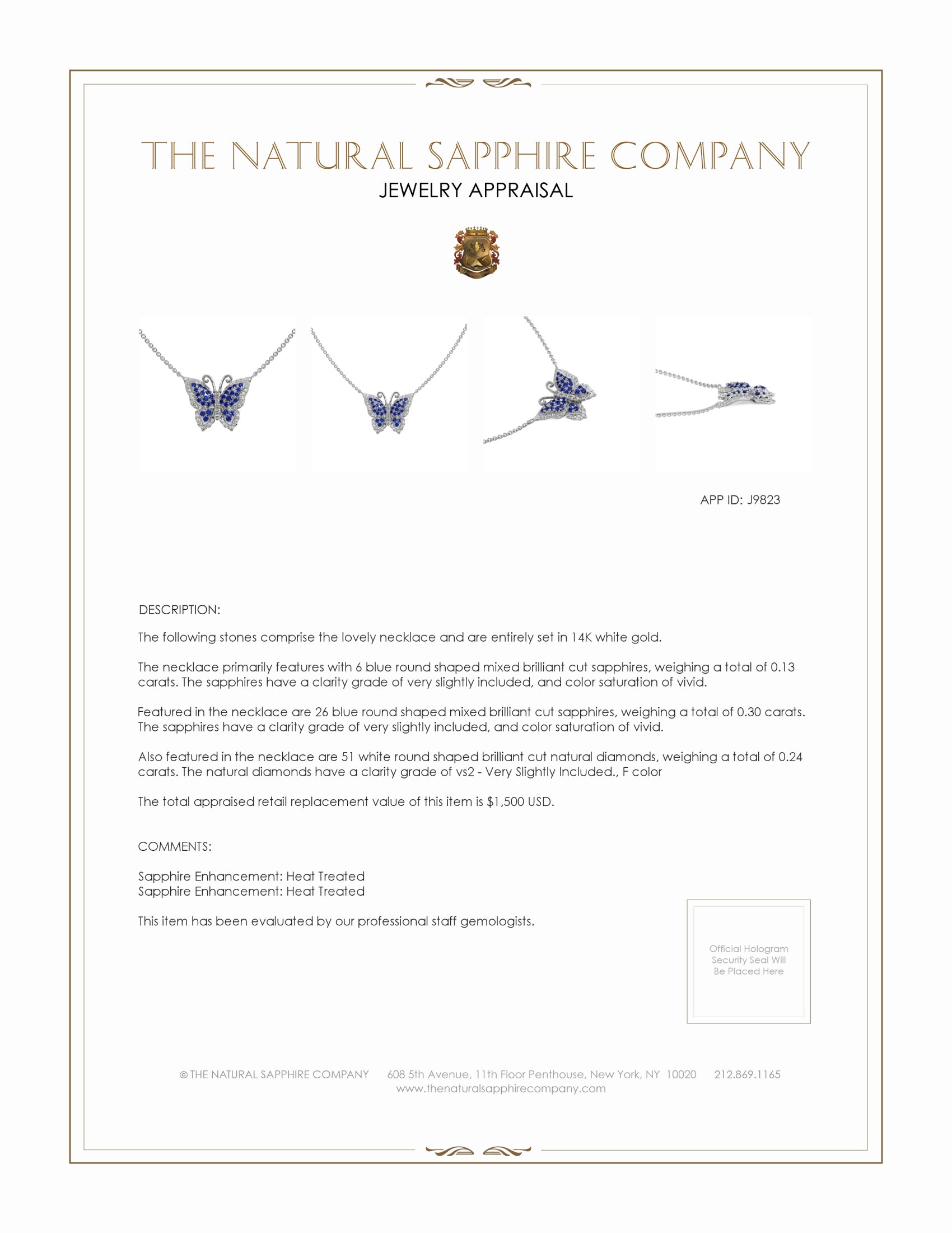 The craftsmanship of this necklace invites the viewer on a journey of graceful beauty. Sculpted to perfection, the butterfly’s delicate wings shimmer with deep blue sapphires, each stone meticulously placed to imitate nature’s splendor. These radiant sapphires, known for their calming properties and rich symbolism, serve as the heart of the design, transforming the butterfly into a symbol of serenity and transformation. The surrounding diamonds, like celestial dust, enhance the wings with their radiant sparkle, reflecting light with every gentle movement.