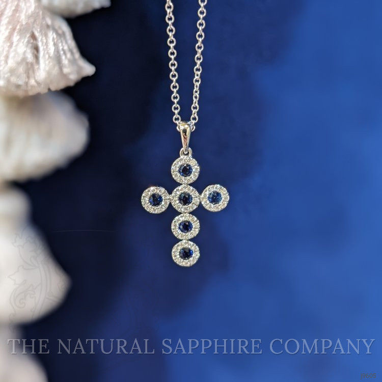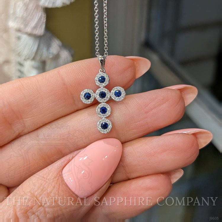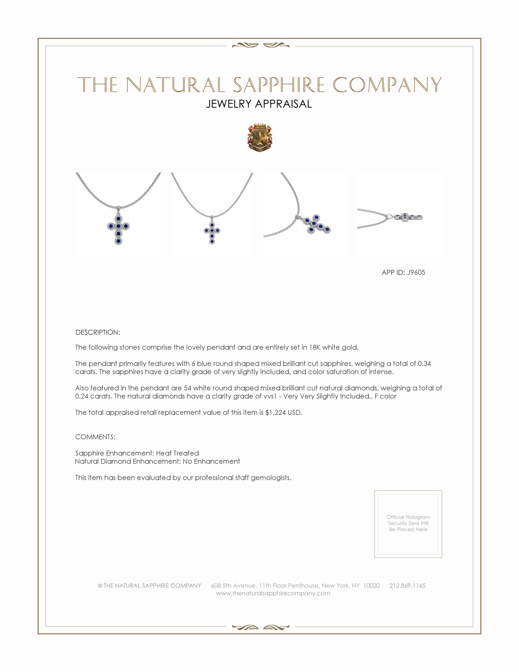 The following stones comprise the lovely pendant and are entirely set in 18K white gold. The pendant primarily features with 6 blue round shaped mixed brilliant cut sapphires, weighing a total of 0.34 carats. The sapphires have a clarity grade of very slightly included, and color saturation of intense. Also featured in the pendant are 54 white round shaped mixed brilliant cut natural diamonds, weighing a total of 0.24 carats. The natural diamonds have a clarity grade of vvs1 - Very Very Slightly Included., F color