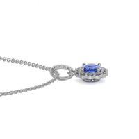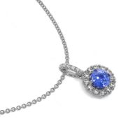 As sunlight plays through its depths, the pendant is further graced with a constellation of 18 resplendent white diamonds. These minuscule essences of eternal frost, each round and brilliant cut, weave a delicate halo around the sapphire. The diamonds, together weighing a total of 0.25 carats, possess a whisper of distinction with their VS2 clarity grade. Their brilliance is matched by the pure blinding white of their F color, creating a vision so captivating it defies the fleeting nature of time. Each diamond reflects an intimate story, a silent vow of forever that only a tangible collection of nature's wonders could symbolize.