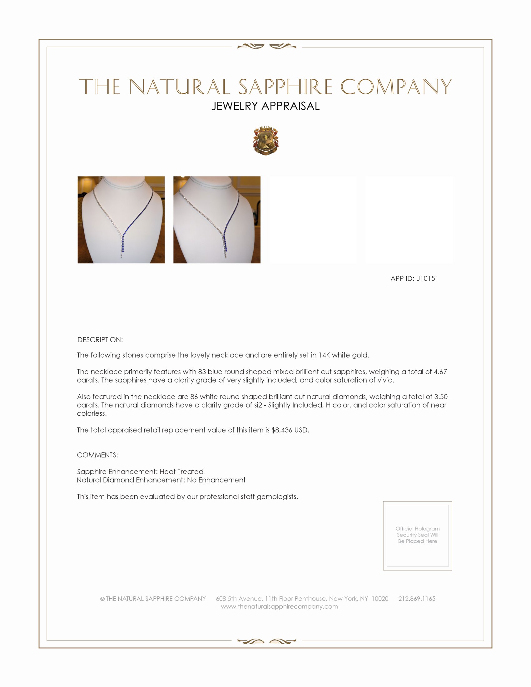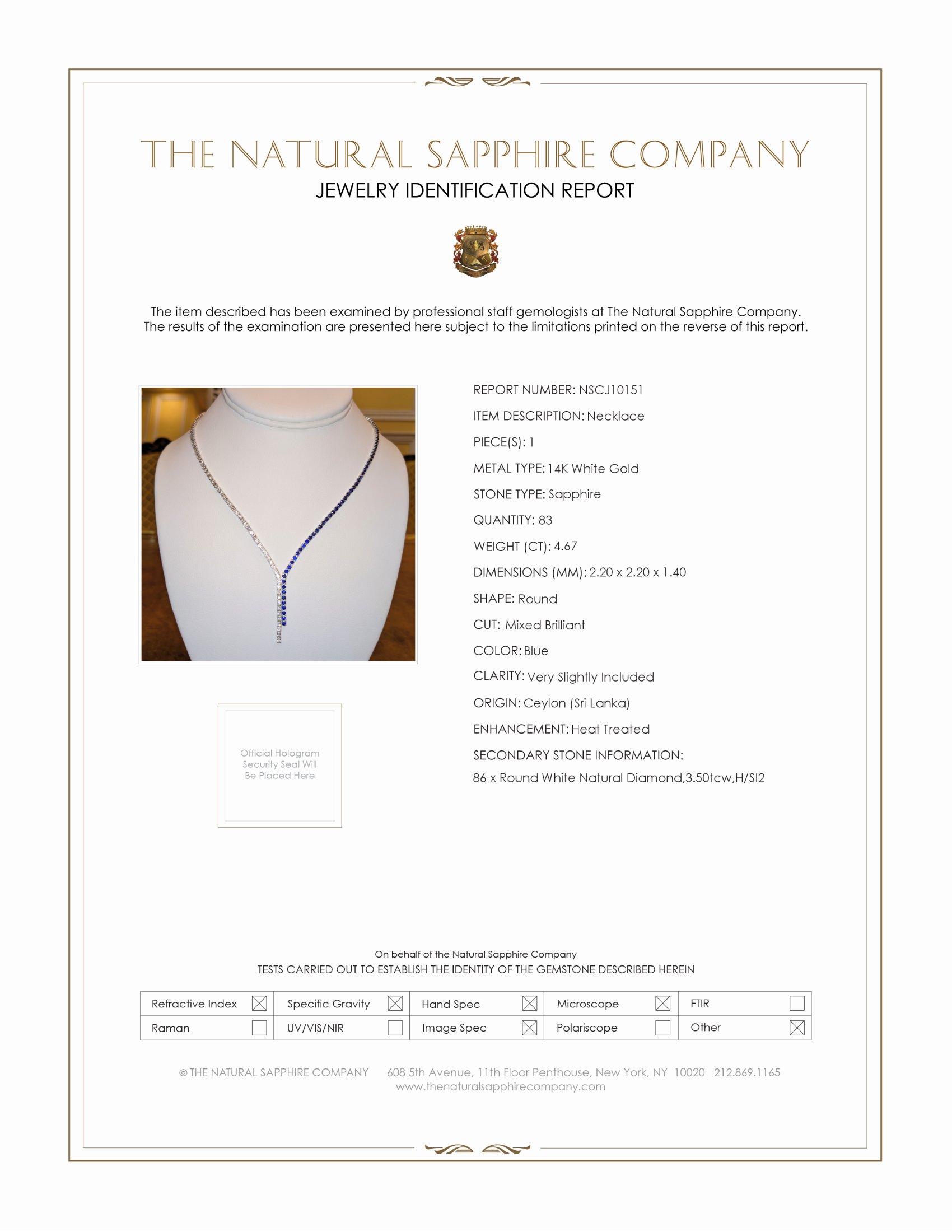 At the heart of the necklace lie 83 blue round-shaped mixed brilliant cut sapphires, totaling 4.67 carats. Renowned for their vivid color saturation, these sapphires possess a clarity grade of very slightly included, enhancing their natural allure. Each stone is selected for its rich, intense hue, contributing to a design that exudes both luxury and understated beauty.