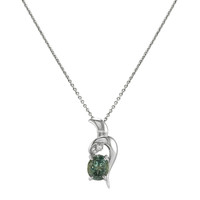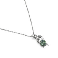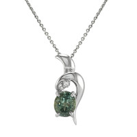 The following stones comprise the lovely pendant and are entirely set in 14K white gold. The pendant primarily features a beautiful, transparent 1.75 carat oval shape green sapphire with the dimensions of 7.60 x 6.60 x 5.90 mm and is mixed brilliant cut. It has a clarity grade of slightly included (evaluated at eye level), intense color intensity, and an excellent polish. The origin of this sapphire is Montana. Also featured in the pendant are 1 white round shaped mixed brilliant cut natural diamonds, weighing a total of 0.01 carats. The natural diamonds have a clarity grade of vvs1 - Very Very Slightly Included., F color