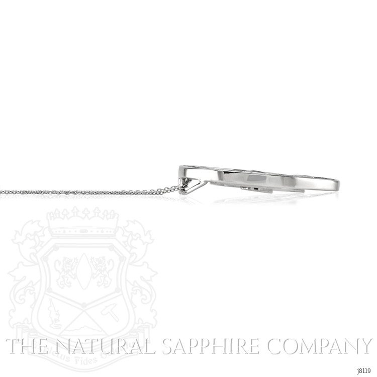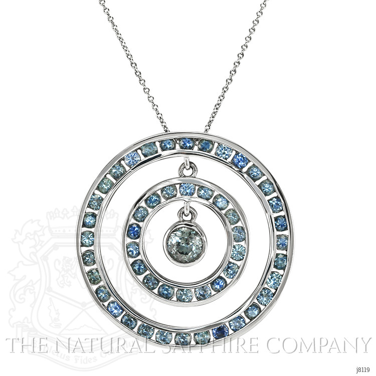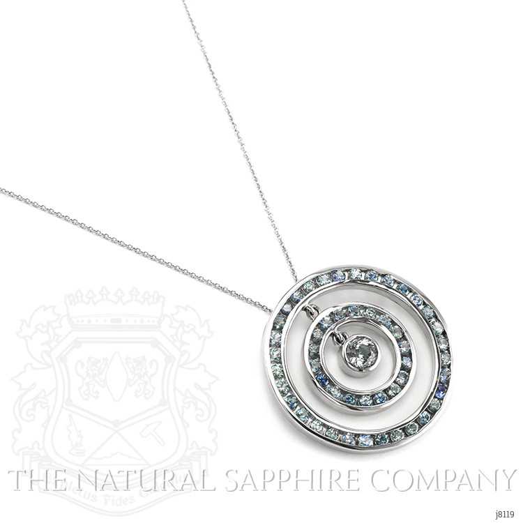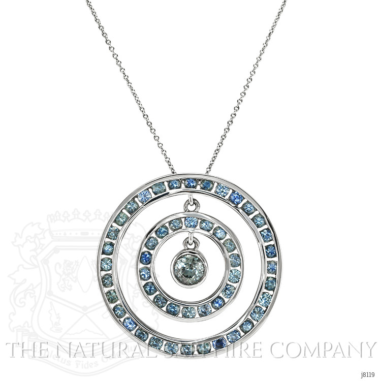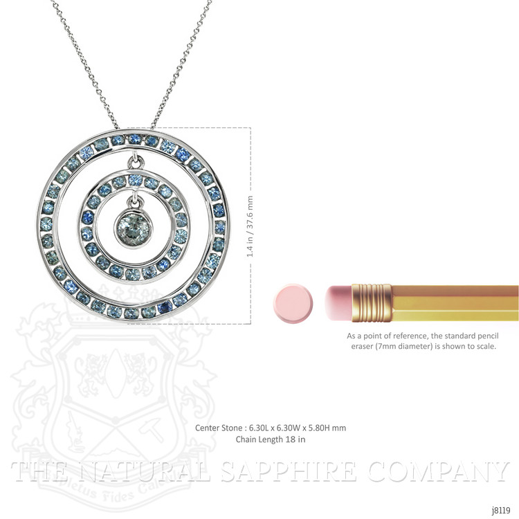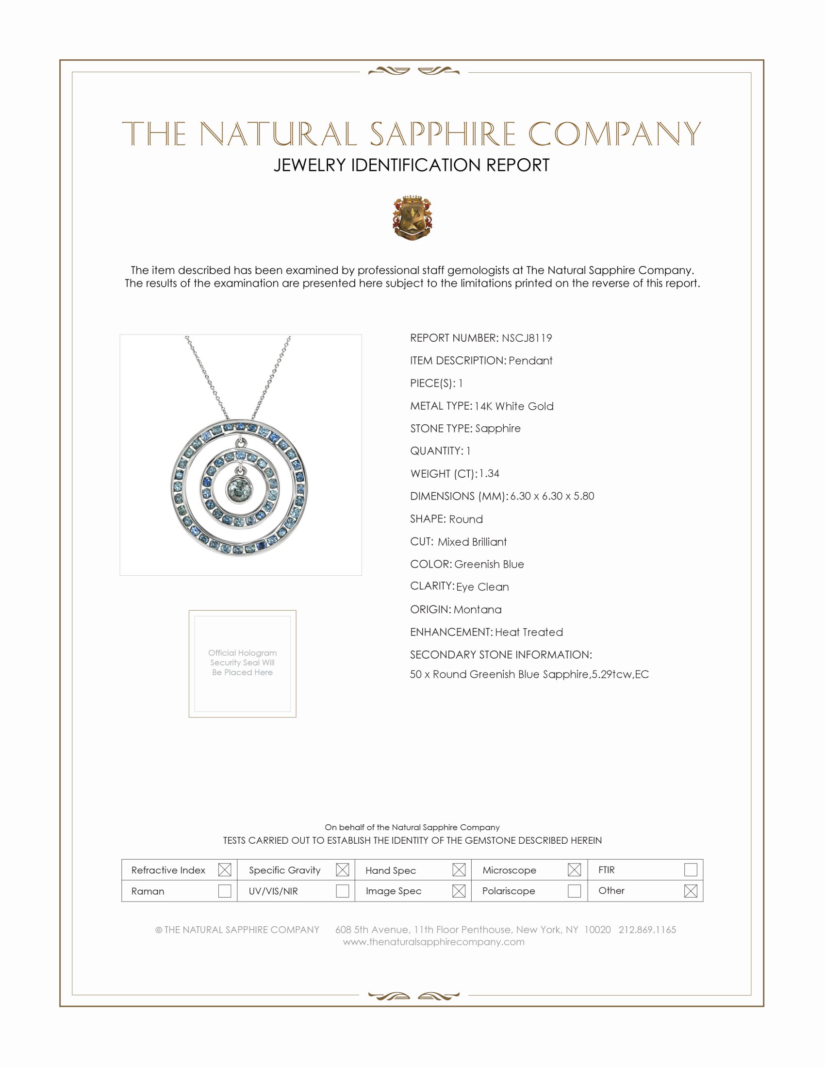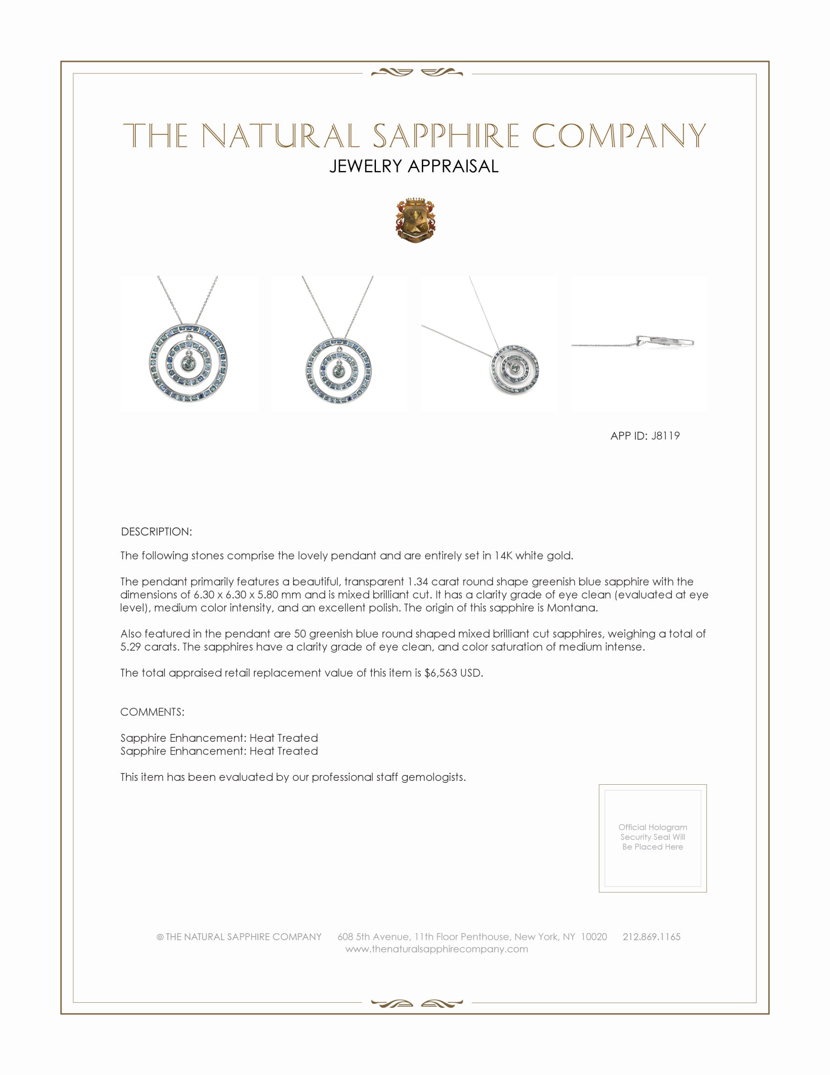 The following stones comprise the lovely pendant and are entirely set in 14K white gold. The pendant primarily features a beautiful, transparent 1.34 carat round shape greenish blue sapphire with the dimensions of 6.30 x 6.30 x 5.80 mm and is mixed brilliant cut. It has a clarity grade of eye clean (evaluated at eye level), medium color intensity, and an excellent polish. The origin of this sapphire is Montana. Also featured in the pendant are 50 greenish blue round shaped mixed brilliant cut sapphires, weighing a total of 5.29 carats. The sapphires have a clarity grade of eye clean, and color saturation of medium intense.