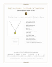The following stones comprise the lovely pendant and are entirely set in 18K white gold. The pendant primarily features a beautiful, transparent 1.40 carat cushion shape greenish yellow sapphire with the dimensions of 7.65 x 5.67 x 3.07 mm and is mixed brilliant cut. It has a clarity grade of very slightly included (evaluated at eye level), medium color intensity, and an excellent polish. The origin of this sapphire is Ceylon (Sri Lanka). Also featured in the pendant are 31 white round shaped mixed brilliant cut natural diamonds, weighing a total of 0.40 carats. The natural diamonds have a clarity grade of vs1 - Very Slightly Included., F color