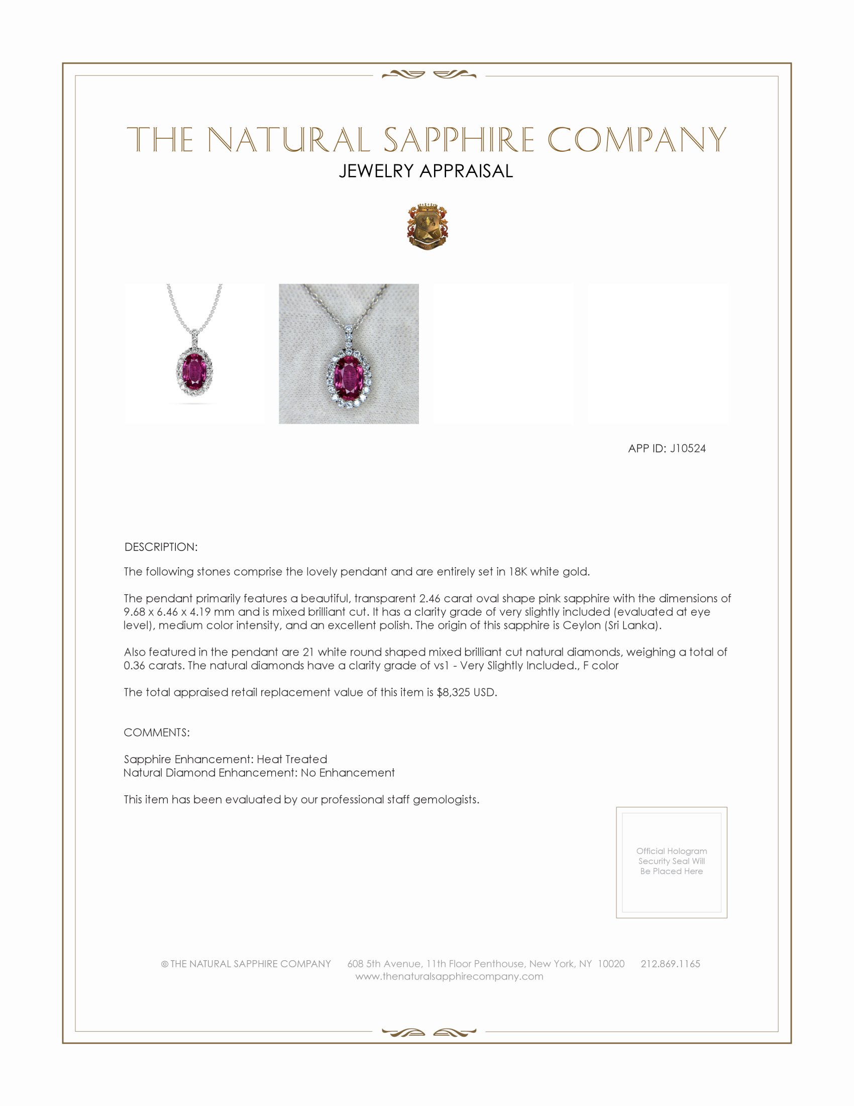 2.46 Ct. Pink Sapphire and Natural Diamond Pave Pendant, 18K White Gold