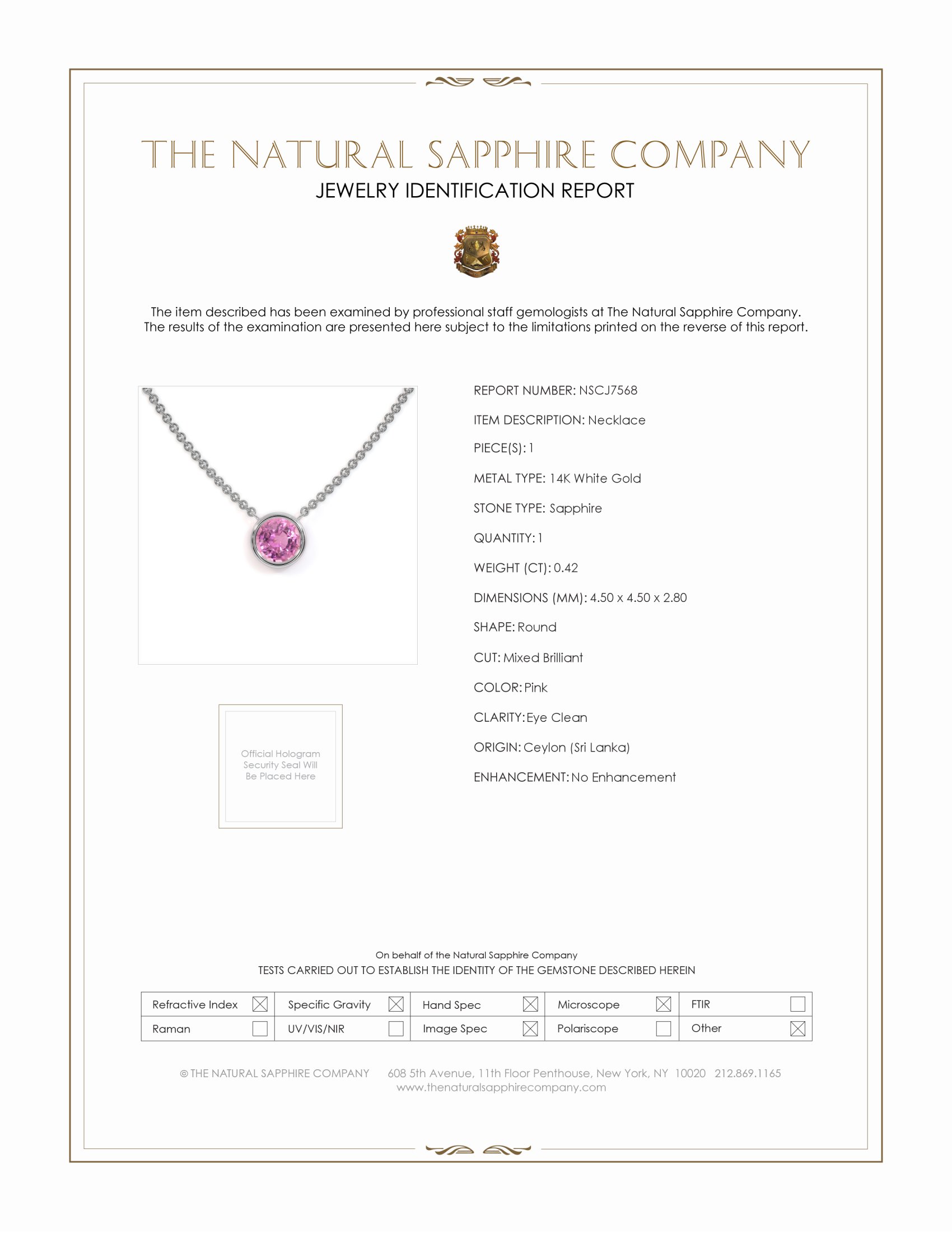 At the heart of this shimmering necklace lies a rare gem that captivates with its beauty, a 0.42-carat pink Sapphire that serves as the focal point of an exceptional creation. Its round shape, along with dimensions of 4.50 x 4.50 x 2.80 mm, makes it the epitome of divine symmetry. The mixed brilliant cut not only enhances its innate brilliance but also reflects the impeccable craftsmanship that defines The Natural Sapphire Company. Resplendent and pure, this Sapphire is of an eye-clean clarity grade, revealing no imperfections by the discerning eye. The radiant gem is cradled in a bed of 14K white gold, an ethereal casing befitting such a gemstone of magnitude.