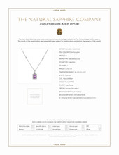 The following stones comprise the lovely pendant and are entirely set in 18K white gold. The pendant primarily features a beautiful, transparent 1.05 carat cushion shape purplish pink sapphire with the dimensions of 7.46 x 5.30 x 3.29 mm and is mixed brilliant cut. It has a clarity grade of eye clean (evaluated at eye level), intense color intensity, and an excellent polish. The origin of this sapphire is Ceylon (Sri Lanka). Also featured in the pendant are 31 white round shaped mixed brilliant cut natural diamonds, weighing a total of 0.40 carats. The natural diamonds have a clarity grade of vs1 - Very Slightly Included., F color