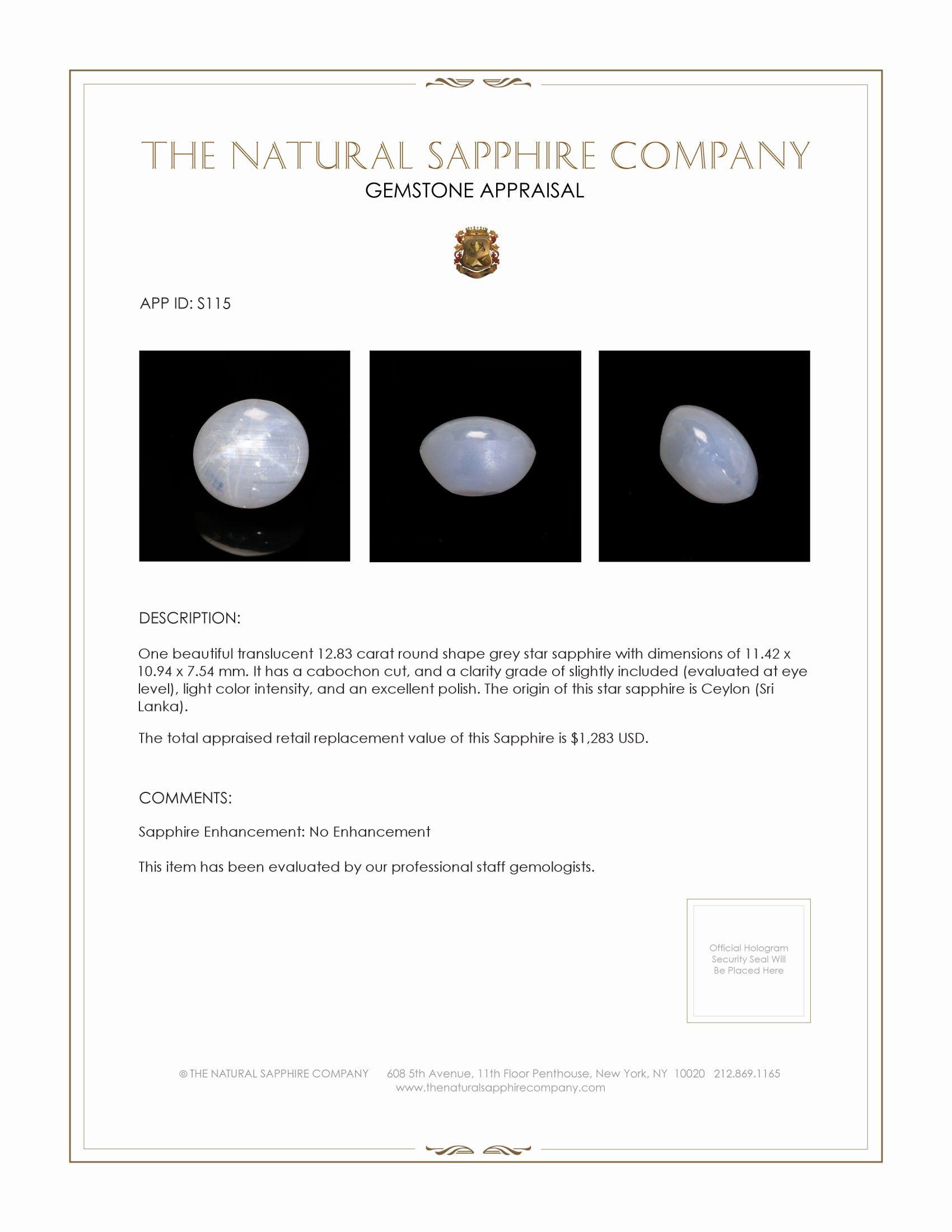 The allure of the 12.83-carat grey star sapphire lies not only in its striking physical characteristics but also in its storied provenance. This exquisite gemstone boasts a nearly perfect round shape and dimensions of 11.42 x 10.94 x 7.54 mm, marking it as a substantial piece ideal for both collectors and connoisseurs. Cut in a cabochon style, the star sapphire is distinguished by its smoothly polished domed surface, which serves as a canvas for the subtle asterism that dances under light. The mineral inclusions within, visible at eye level, are integral to creating this star effect, lending the gemstone its characteristic charm while showcasing nature's unparalleled craftsmanship. The cabochon cut is meticulously executed to maximize this phenomenon, a testament to a quality that buyers familiar with gemstone clarity and cut will undoubtedly appreciate.