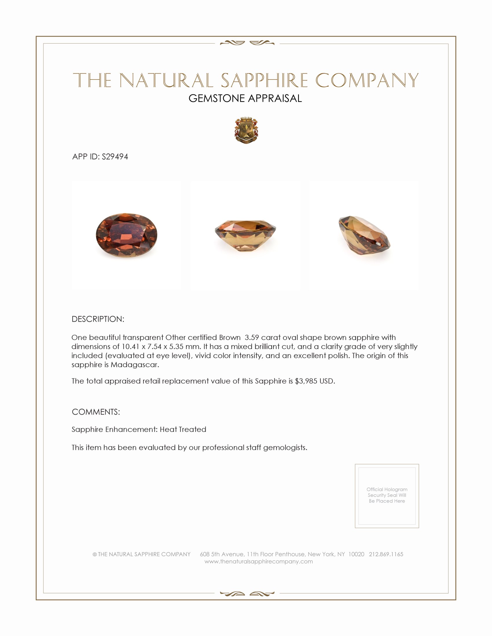 This Other certified Brown 3.59 carat oval shape brown sapphire from Madagascar represents a rare opportunity to own a gem that sits within a very small circle of connoisseurs, from the unmistakable weight and presence to the vivid color intensity that announces itself with every turn. Measuring 10.41 x 7.54 x 5.35 mm, this stone carries an oval silhouette that flatters both classic and contemporary settings, while the very slightly included clarity when evaluated at eye level assures that light moves through the crystal with remarkable purity. Heat treated to reveal and stabilize its deep brown hues, and finished with an excellent polish, this sapphire reads as both timeless and distinct, a jewel that feels bespoke and exclusive by design. The Natural Sapphire Company is proud to present this gem as a limited offering, an invitation to join an elite group of collectors who value provenance, craftsmanship, and the quiet authority of a stone that does not demand notice, it earns it.