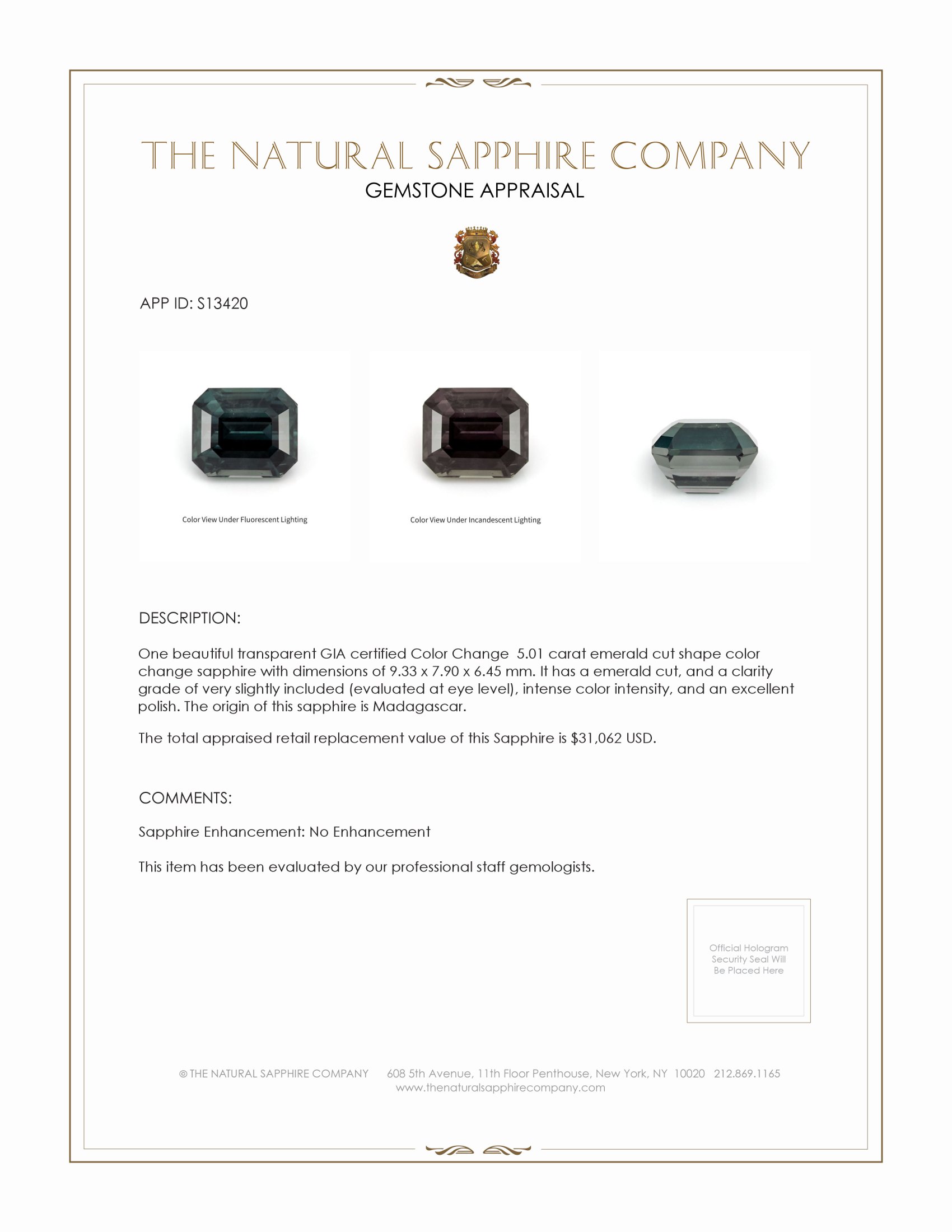 The sapphire’s dimensions, at 9.33 x 7.90 x 6.45 mm, speak to its crafted precision. Its emerald cut, renowned for showcasing a stone’s true clarity and depth, enhances its intrinsic allure, whispering secrets of endless devotion with each facet. The stone possesses a clarity grade of very slightly included, an indicator not merely of its rarity, but of its character, weaving a narrative of nature’s gentle touch. Against the light, this sapphire reveals its core colors with an extraordinary color change phenomenon, an intense color intensity that shifts subtle hues. This sublime display provides a dynamic and emotionally tangible connection, as if the stone reshapes itself to echo the wearer’s innermost thoughts.