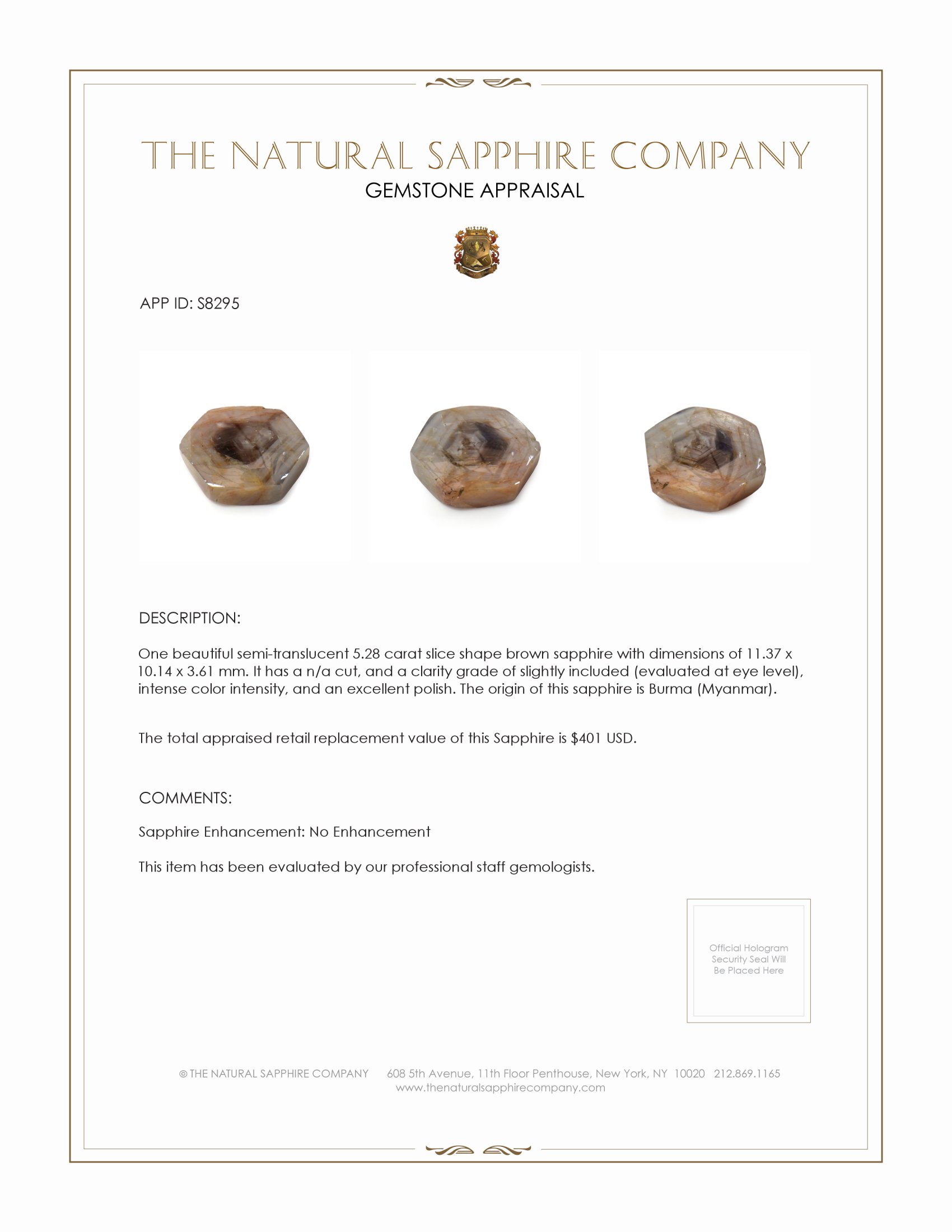 Introducing an exquisite 5.28 carat slice-shaped brown sapphire, a true embodiment of nature's artistry. This gemstone hails from the renowned gem-rich region of Burma, Myanmar—a locale esteemed for yielding some of the most exquisite sapphires in the world. With its semi-translucent allure and slightly included clarity, this sapphire offers a unique depth and personality. The intense color intensity enhances its warm, earthy hues, ranging from deep mocha to lighter, golden undertones, reminiscent of a serene autumn landscape bathed in soft sunlight.