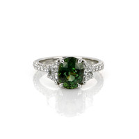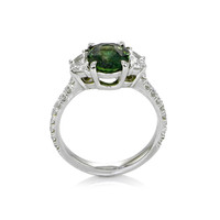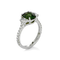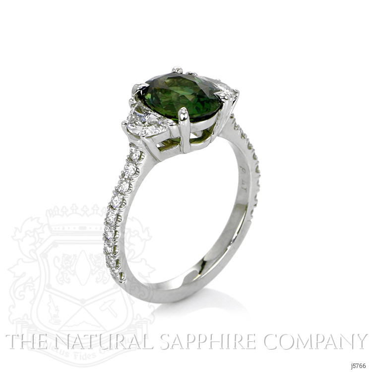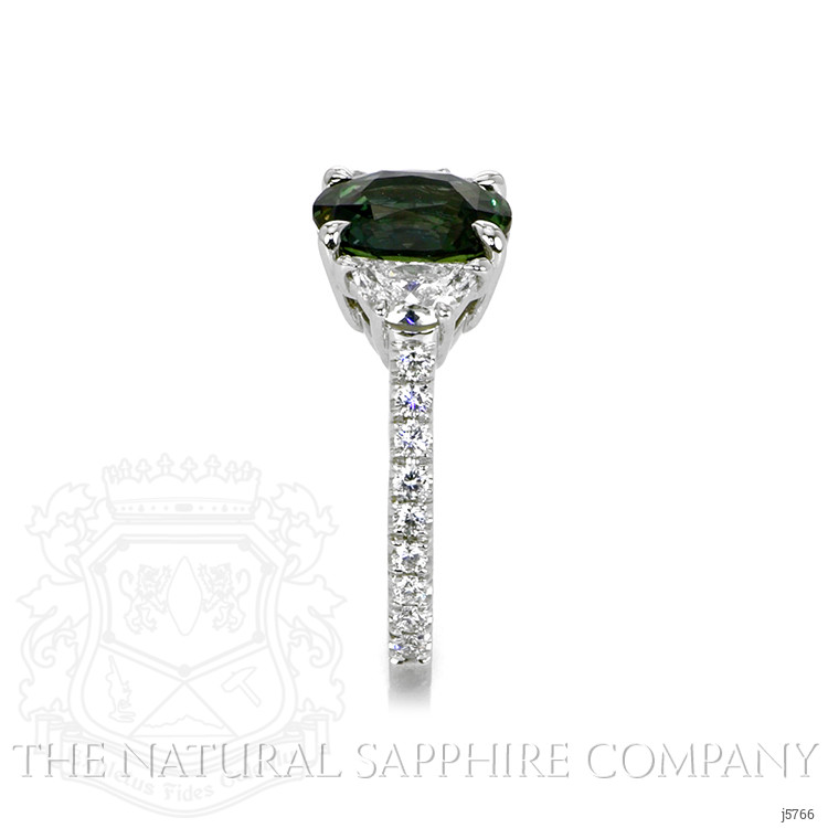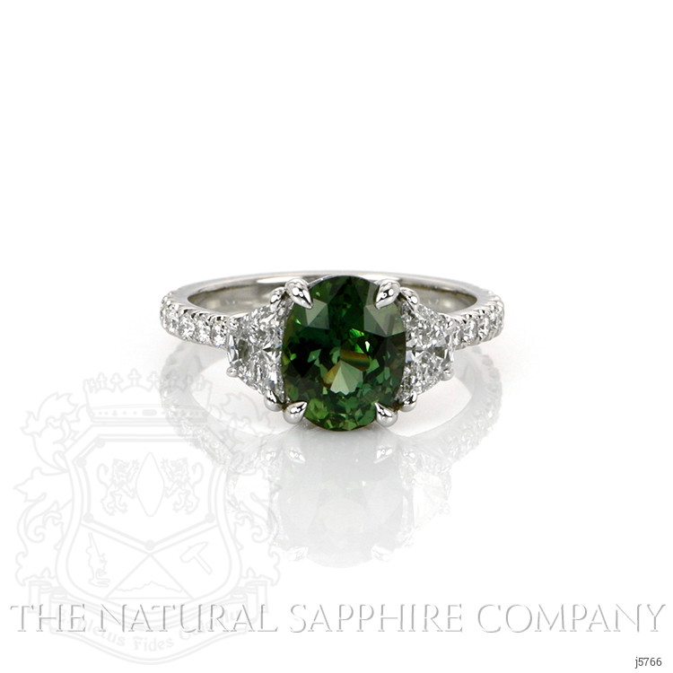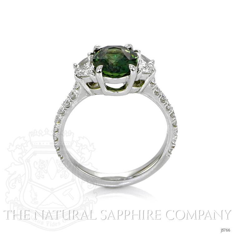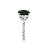 The strength of love is put to the test when things are not ideal. It is easy when all is well. But when obstacles arise, that is when the true metal of your love is revealed. If your special someone has weathered tough times with you and come through with flying colors, you know you have someone with whom you can share life’s joys and burdens. Let this extraordinary sapphire and diamond ring in platinum symbolize your devotion. Its 2.58 carat natural untreated oval green sapphire from Madagascar with incredible hue, tone, and vivid saturation is flanked by two half-moon diamond side stones totaling 0.54 carats. Eighteen dazzling F color diamond rounds totaling 0.27 carats accent the shank. This ring is destined to endure for all time - just like your bond.