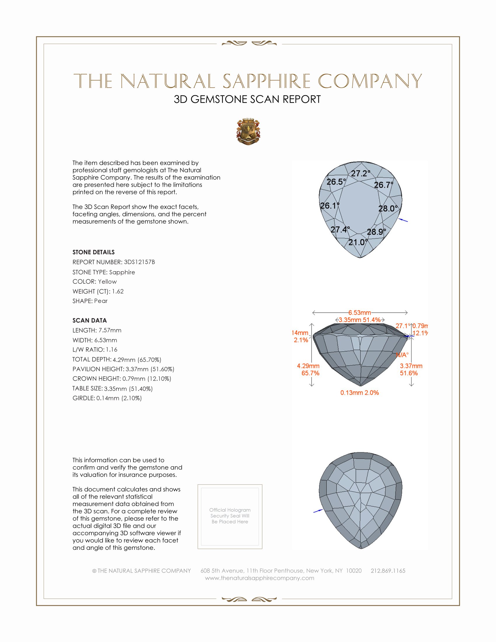 The Natural Sapphire Company presents an exquisite 1.62 carat pear-shaped yellow sapphire, distinguished by its remarkable transparency and captivating natural beauty. Certified by the Gemological Institute of America, this sapphire stands as a testament to both nature's artistry and gemstone craftsmanship. With dimensions precisely measured at 7.57 x 6.53 x 4.29 mm, the stone's elegant silhouette serves as a perfect canvas for its vibrant hues and outstanding clarity. The mixed brilliant cut enhances its inherent brilliance, allowing light to dance across its surface with mesmerizing allure. Evaluated at eye level, the gem boasts an eye-clean clarity grade, ensuring a pristine viewing experience that meets the discerning standards of gem enthusiasts and collectors alike.
