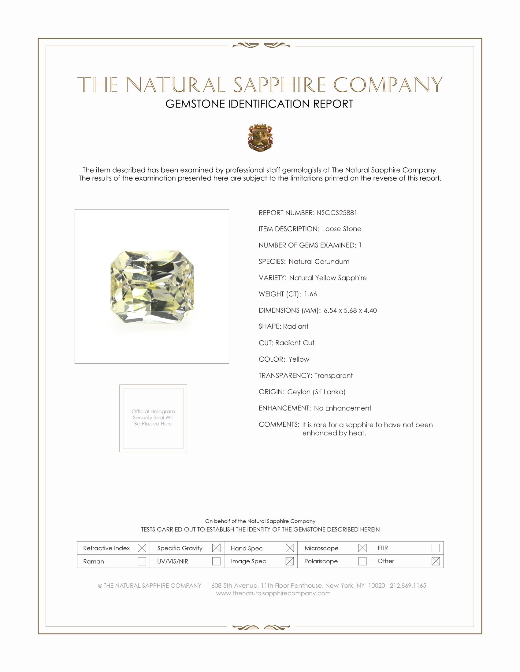 Imagine capturing a moment of bliss, a slice of sunshine tucked within your palm, ready to gift to someone whose smile lights up your world. Our exquisite yellow sapphire, harvested from the lush lands of Ceylon, invites you to become part of its extraordinary journey, weaving your memories with its age-old legacy. Radiating warmth and joyous elegance, this 1.66 carat gemstone is not just an adornment but a promise of golden moments shared with someone you care deeply for. The Natural Sapphire Company is proud to present a jewel that symbolizes both luxury and timeless affection, providing an unforgettable gesture emanating pure love.