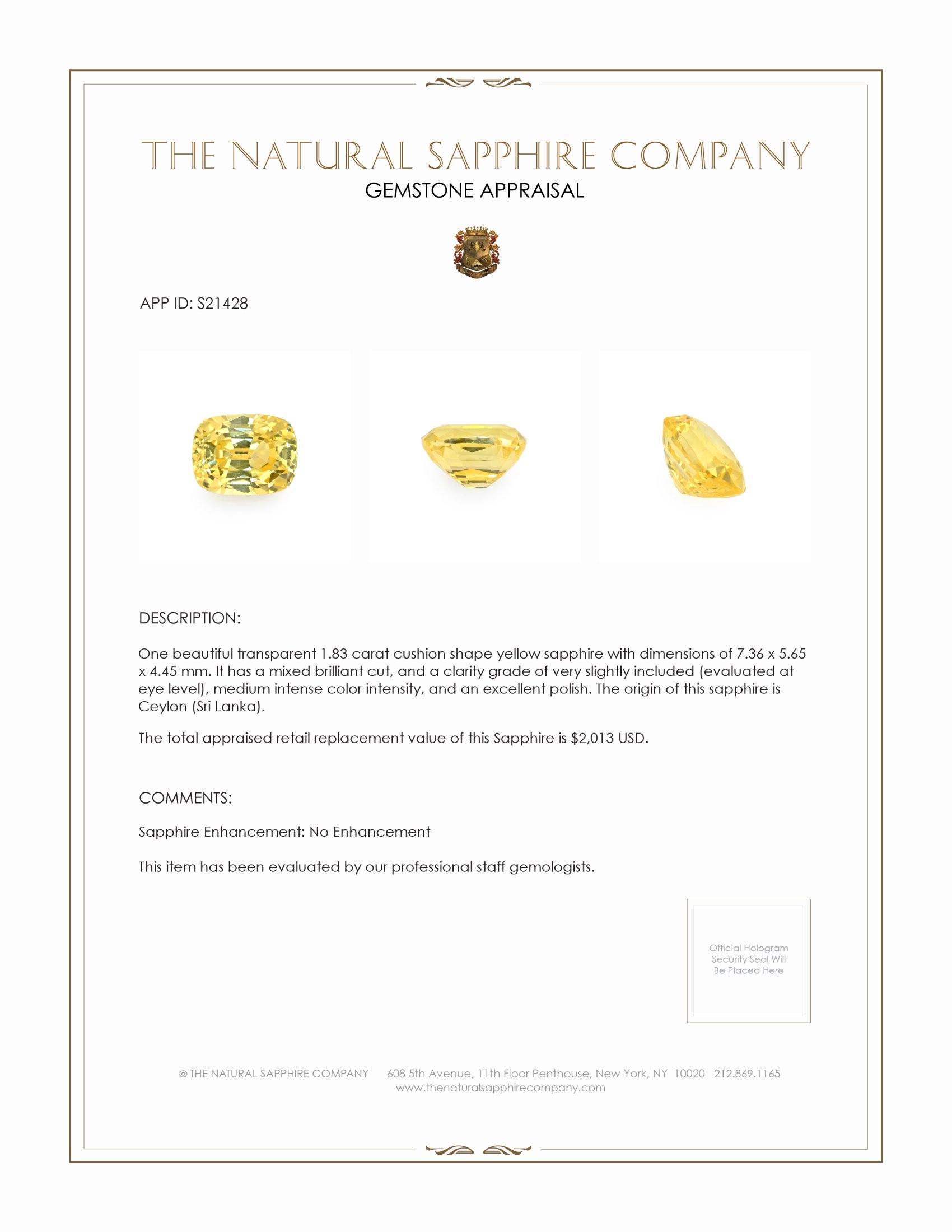Introducing a truly exquisite gemstone that epitomizes the intersection of natural beauty and skilled craftsmanship. This transparent 1.83-carat cushion-shaped yellow sapphire is a testament to nature’s splendor and the artistry involved in bringing out its finest characteristics. Mined in the renowned gemstone-rich lands of Ceylon, now known as Sri Lanka, this sapphire draws on a centuries-old legacy of producing gemstones of unparalleled quality and brilliance. At The Natural Sapphire Company, we pride ourselves on offering gemstones that not only meet but exceed the exacting standards of connoisseurs around the world.